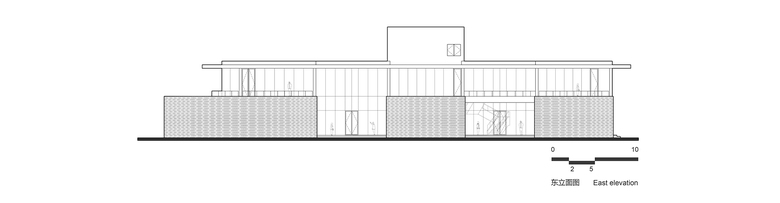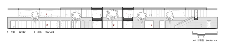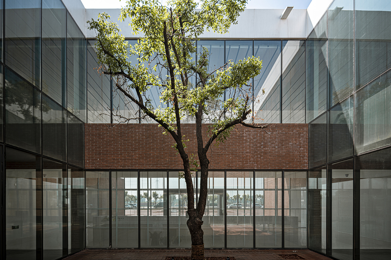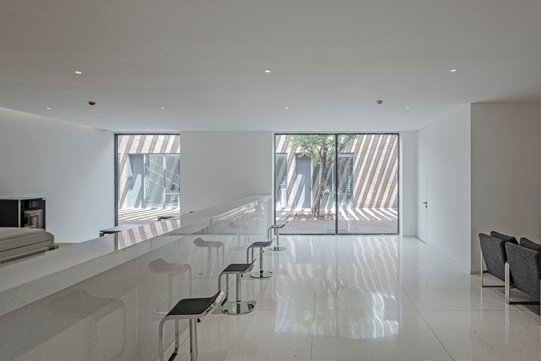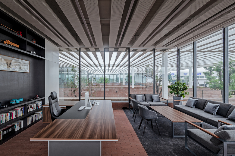 The office building consists of two floors, which present totally different visual impressions. 1F is enclosed and inward-facing, while 2F is open and outward-facing. Such contrast highlights the horizontal layout of the overall architectural space. The building has a "floating" rooftop, a solid pedestal and a transparent space in between, which is similar to the image of traditional architectures to some extent. Several two-storey-high courtyards separate 1F into three parallel horizontal functional blocks. In this way, each room on 1F is connected with a courtyard, ensuring ample daylight and forming diversified landscape. Besides, the block on the south itself includes some small-scale courtyards. 2F has a large area of glass curtain walls, which mark off various functional spaces of different scales and also enable indoor activities to be extended to outdoor terraces freely. Six bridges link the three functional blocks of the building, generating efficient circulation routes and further dividing off several inward-facing yards.
