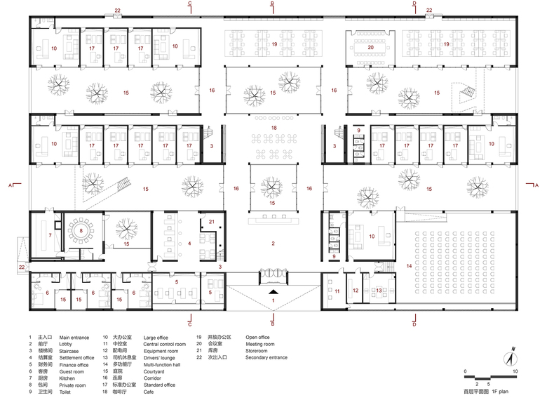 Focusing on the basic characteristics of office buildings and combining indoor and outdoor scenes, ARCHSTUDIO created a multifunctional working and living compound. The double-height reception lobby faces the front court, which presents a striking first impression, with courtyards and trees unfolding at its back. 1F is composed of various working spaces, including small and medium-sized offices, an open working area and a conference room that face courtyards, a multifunction hall that can accommodate 300 people, a finance office, and a settlement office, etc. Working areas of different departments are separated, so as to avoid interference. At the junctions of circulation routes, some leisure areas were set, such as a cafe which faces a courtyard with a tree, with a view to enabling people to communicate or take a break in a relaxing way. Three indoor staircases and two outdoor stair cases lead to 2F, the design of which fully took into account efficiency and smoothness of routes. The space organization on 2F is more flexible, which contains several large offices, an expansive conference room, a multimedia room, a reading area, a fitness room, the staff canteen, etc. The transparent glass walls closely connect each room to outside terraces and roof gardens, and integrate interior and outdoor spaces into a whole.