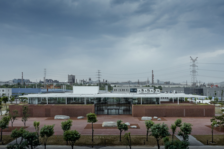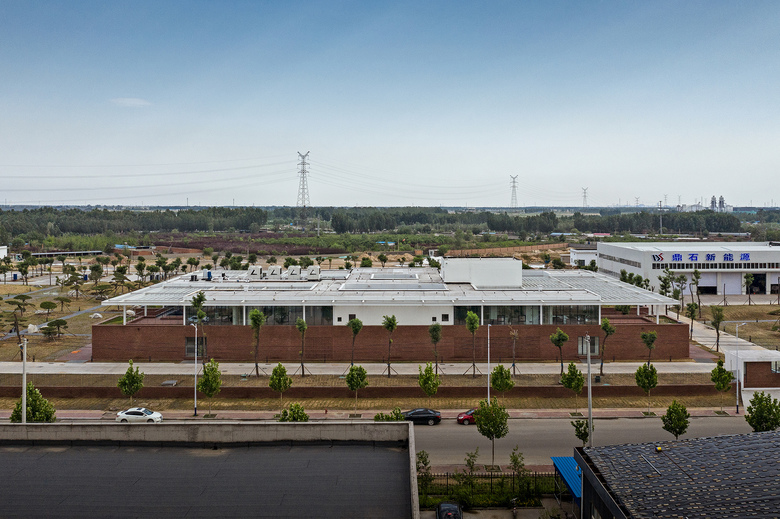 The project is an office building of a logistics company, located in an industrial park on the outskirts of a city in Northern China. The industrial park occupies a plain and expansive land area, which is adjacent to an urban road on the north and next to an unexploited urban land on the south. The office building was planned to sit at the middle of the industrial park, with pine trees, lawns and footpaths forming gardens on its north and west sides, while on the south side is a wide front court and a parking lot.