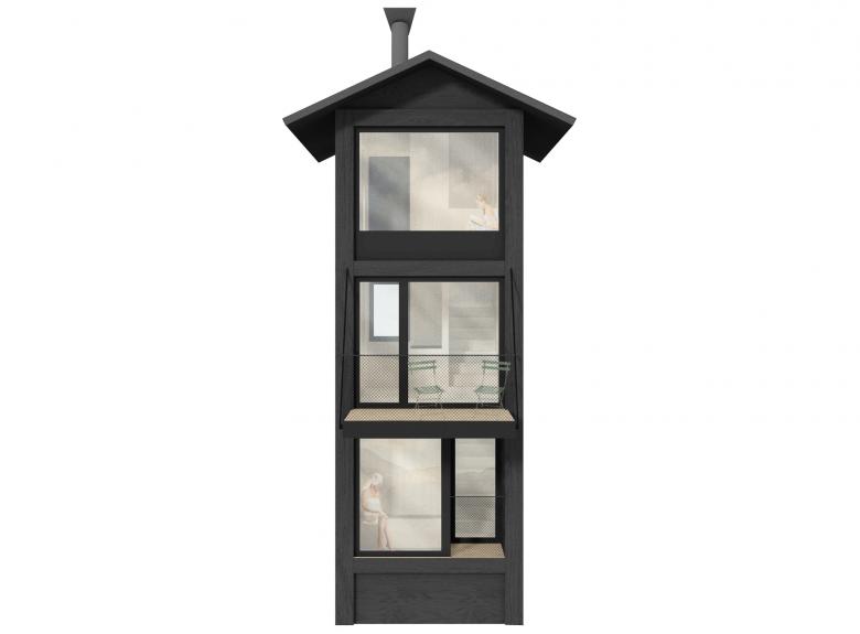 Minimal Units: Zwei einfache, nur 3.20m breite Holzhäuser bieten jeweils auf drei Geschossen verteilt ein Schlaf-/ Wohnzimmer, ein Esszimmer mit kleiner Küche, eine Sauna mit Aussenduche und einen Balkon.