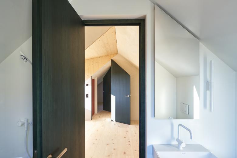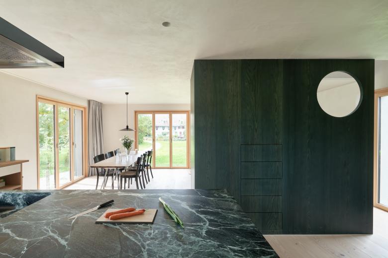 Im Sinne einer Binnenverdichtung sind im Souterrain ein Schlafzimmer sowie ein Badezimmer situiert. Eine vorhandene, ehemals von einem Öltank besetzte unterirdische Räumlichkeit wird neu als Werkraum genutzt. Der offene Wohn-/ Essraum im Hochparterre kontrastiert zur kleinteiligen Grundrissstruktur im Unter- und Obergeschoss.