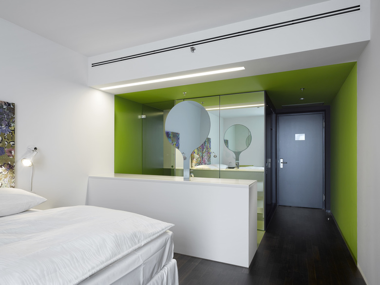 Eine wichtige Vorgabe für den Bau des Gebäudes war ein sehr enger Terminplan. Das Hotel sollte in kürzester Zeit erstellt werden - die Bauzeit betrug etwa zehn Monate. Das hatte Konsequenzen für die Materialisierung und die Gebäudestruktur. Betonbauarbeiten beschränkten sich auf eine Bodenplatte und zwei Treppenanlagen. Das Gebäude besteht aus vorgefertigten Holzelementen mit hohen Anforderungen bezüglich Brand- und Schallschutz. Die möglichst offene Lobby stellte hohe statische Anforderungen an die tragend ausgebildeten Trennwände im 1. OG.