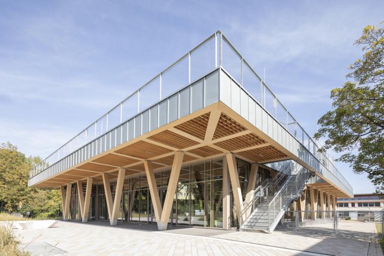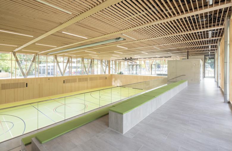 Mit der großzügig gestalteten Kultur- und Sporthalle hat die Gemeinde Alfter einen neuen kommunalen Treffpunkt erhalten. Das Gebäude kann über drei Etagen genutzt werden. Die Event- und Sportfläche ist im unteren Bereich untergebracht, darüber liegt die Foyerebene mit Quartierscafé und Tribünenbereich. Auf der Dachebene befinden sich ein Ballsportfeld mit Fitnessareal. Diese ist ganztägig frei zugänglich und kann unabhängig von der Hallenbelegung genutzt werden. Neben der Nutzung durch Vereine kann die Halle für Veranstaltungen mit bis zu 400 Personen genutzt werden. Die Halle besteht aus einer innovativen Holzkonstruktion, bei der Fachwerkträger aus Buchenholz mit einer Spannweite von fast 25 Metern das Gewicht der Dachkonstruktionen in außenliegende V-Stützen ableiten, die ebenfalls aus Buchenholz gefertigt sind. Die umlaufende Holzkonstruktion ruht auf einem Sockelgeschoss aus Stahlbeton. Das gedrungene Fachwerk erhält durch den Treppenversatz an den Druckstreben ein tragendes und gleichzeitig ästhetisches Detail, das die moderne und traditionelle Holzbaukunst vereint.