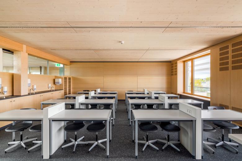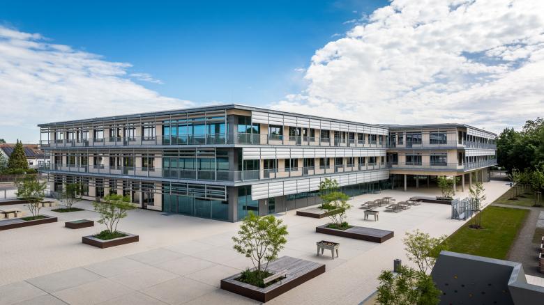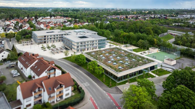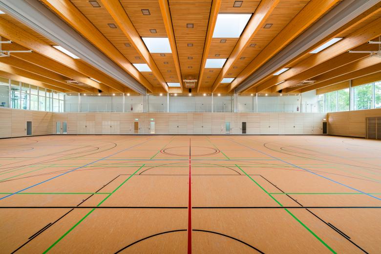 Modern und nachhaltig zeigt sich das neue Gymnasium in Gersthofen. Der Campus besteht aus drei zusammenhängenden Kuben, einer Dreifachsporthalle und einer Mensa. Der Neubau hat eine Hauptnutzfläche von ca. 8.500 m² und ist nach den neuesten energetischen Vorgaben realisiert worden. Neben der Nachhaltigkeit war die Umsetzung neuer pädagogischer Konzepte, mit Lernlandschaften und einer größtmöglichen Nutzungsflexibilität wichtig. Die Tiefgarage, das Untergeschoss und Teile des Erdgeschosses sind in Stahlbetonbauweise realisiert. Die Obergeschosse zeigen sich in Holzbauweise. Außenwände sind in Holztafelbau, das Dach in Brettsperrholz und die Decken in Holz-Beton-Verbundbauweise entstanden. Innen bilden sichtbare Holzstützen und Holzträger, sowie in die vorelementierten Holzaußenwände integrierte Stützen und Träger als Skelettbau die Tragstruktur unterhalb der Holz-Beton-Verbunddecken und Vollholzdächer mit Spannweiten von bis zu 8,20 m. In der Dreifachsporthalle wurde ein auf dünnen Stahlstützen «schwebendes» Dachtragwerk aus Vollholz-Bindern und Holzrandträgern über eine max. Spannweite der Binder von bis zu 30 m realisiert.
