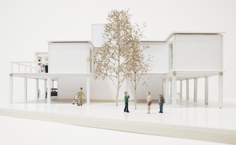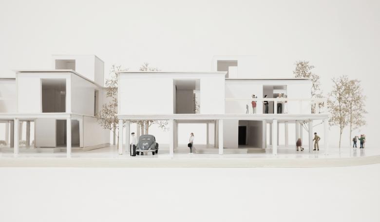 Die Gebäudekörper stehen auf Stützen. Der dadurch entstehende, weiträumig gedeckte, gemeinsame Aussenraum im Erdgeschoss bildet den Übergang vom öffentlichen Strassenraum zum privaten Wohnen und kann mannigfaltig genutzt werden - als Parkplatz, Werkstatt, Spielplatz, Hühnerhof, Gartenanlage, Veranda, etc.