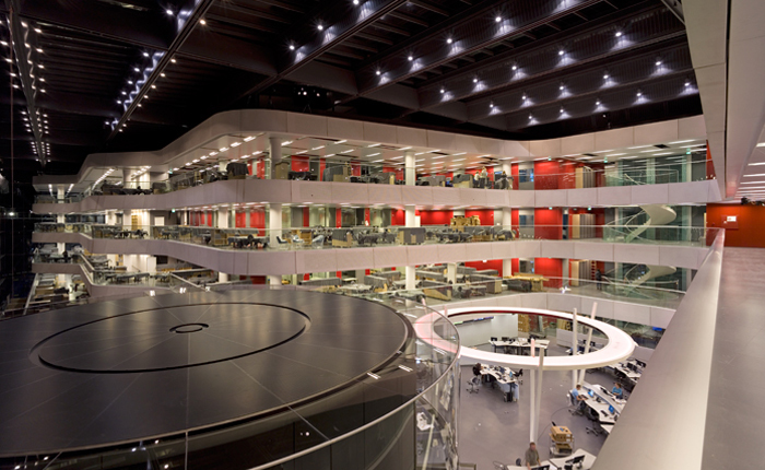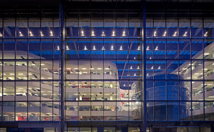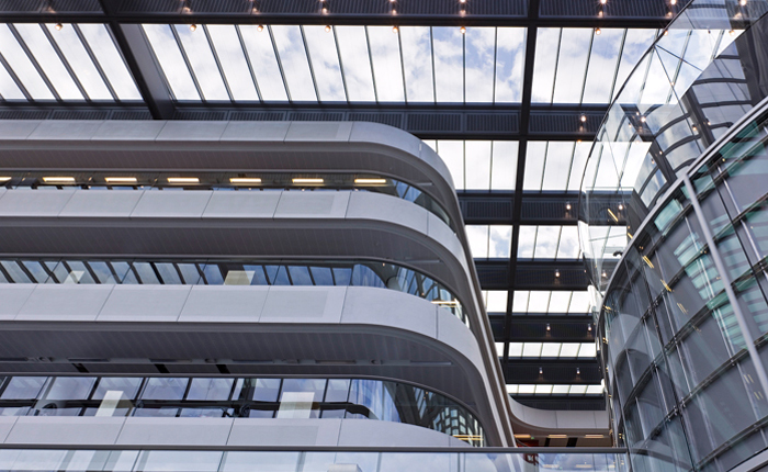 Media House for Danish Broadcasting Corporation The concept of dynamism can be seen in all facets of the building. The large, transparent facade opens the news building towards the urban space, allowing direct views into the enormous atrium embracing the whole building over several floors, creating a connection between the organic, curved balcony, the central news studio and the building’s internal street. The interior design ranges from open office landscapes to various individual rooms for project teams with smaller cellular offices and quiet rooms.