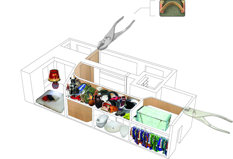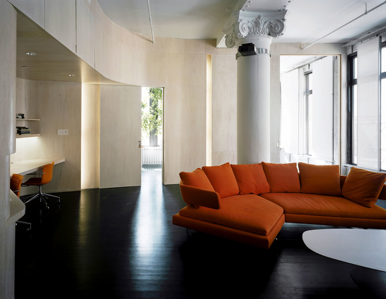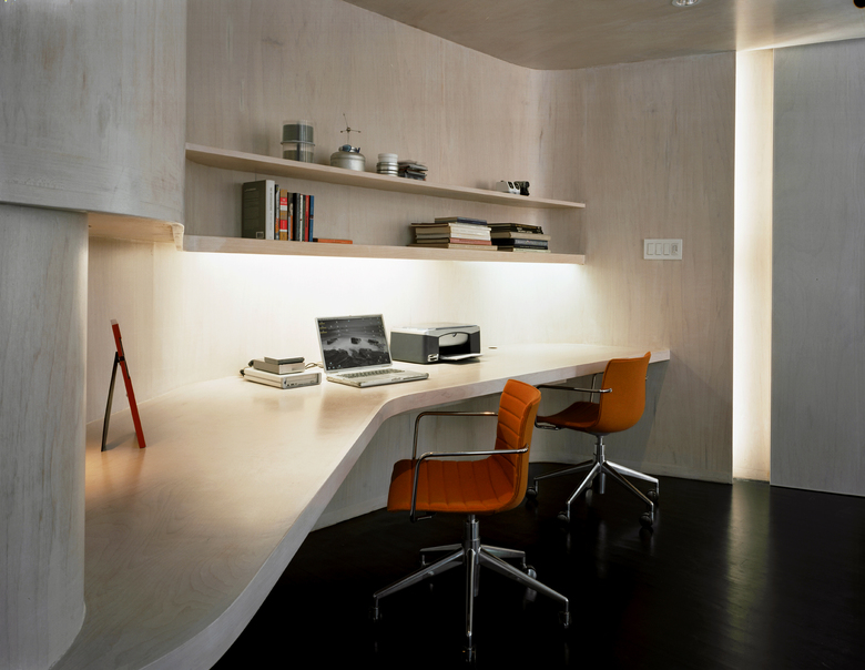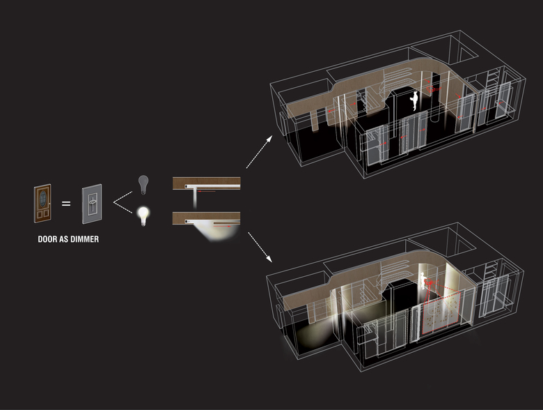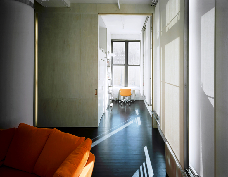 Ply Loft is an artists’ live/work space that responds to the familiar New York predicament of too much program and too little space. A sinuous surface of bendable plywood separates private and storage spaces from the living area, balancing a sense of openness with enclosure. Flush sliding doors of the same ply material double as dimmers for light fixtures concealed in the door pockets: Opening a door diminishes the intensity of artificial light and raises that of daylight, whereas sliding the door shut increases artificial light levels and lowers the amount of daylight. A wall of sliding sheer screens in front of the south-facing windows also modulates daylight. Via the active sliding elements of the sinuous ply surface and the translucent window screens, both artificial and natural light are dynamically modulated according to the artists’ daily activities.