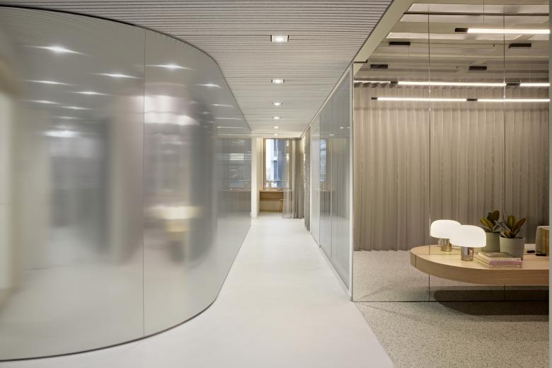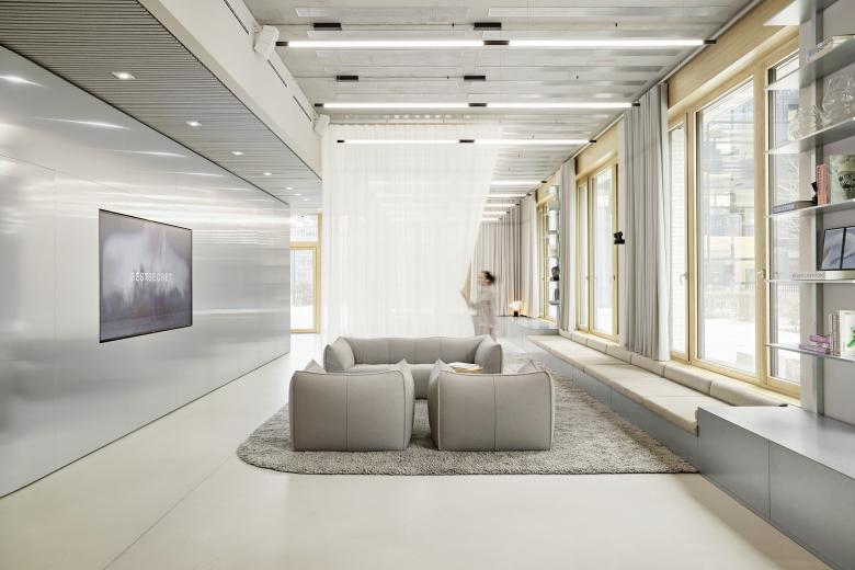 Reduced and timeless in nature, the BESTSECRET brand aesthetic sets the stage for featuring upscale fashion brands in the digital space. The interior design conceived for the new headquarters toys with this idea to transform it into a tangible space using carefully selected colors, materials, and objects. A warm gray shade on the walls works in concert with exposed concrete ceilings and light gray seamless floors to create a neutral backdrop that makes the building the physical equivalent of the digital brand identity. Reflective and mirrored surfaces expand the space visually, while generously applied textile materials establish a reference to the world of fashion.