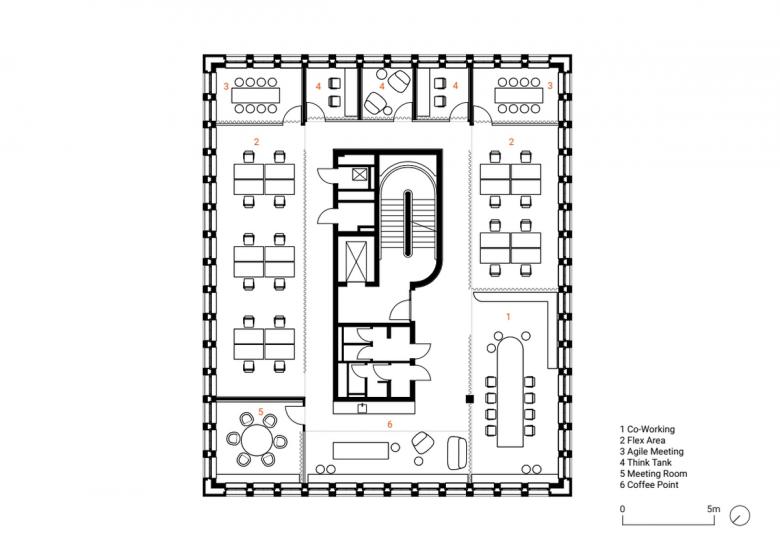 On the upper levels, offices are divided into different zones, including communicative co-working spaces and contemplative think-tank rooms. Floor-to-ceiling curtains allow for flexible, even more granular zoning. Arranging the individual areas was a deliberate design decision: While the more open zones face the vibrant city center, the rooms designed for focused work are located on the quieter side of the building.