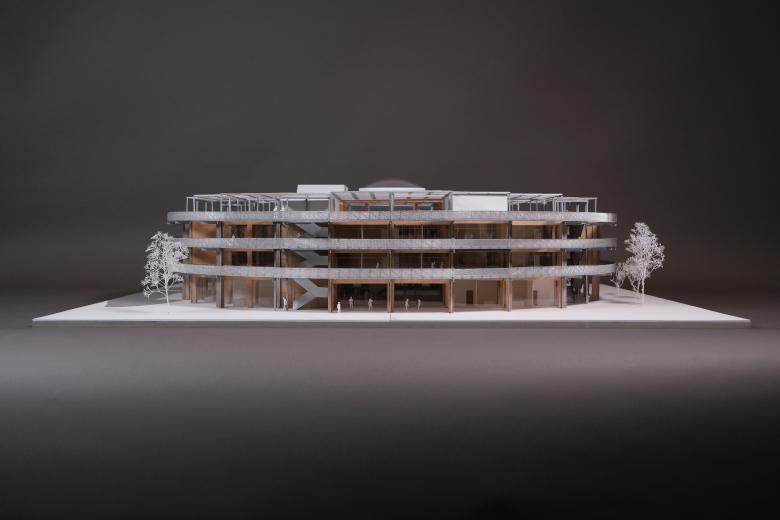 The modular system includes spaces for several smaller companies whose employees can gather in communal areas located around the central atrium for co-working and informal interaction. A generous spiral staircase guides visitors through this communication space, while additional external staircases serve as shortcuts for employees and allow the office units to be accessed independently from the balcony rings. The top floor features rentable event spaces with a rooftop terrace. The Hub’s recessed ground floor establishes a striking north-south axis on the site that links to the lake in the north and to an orchard in the south.