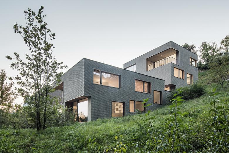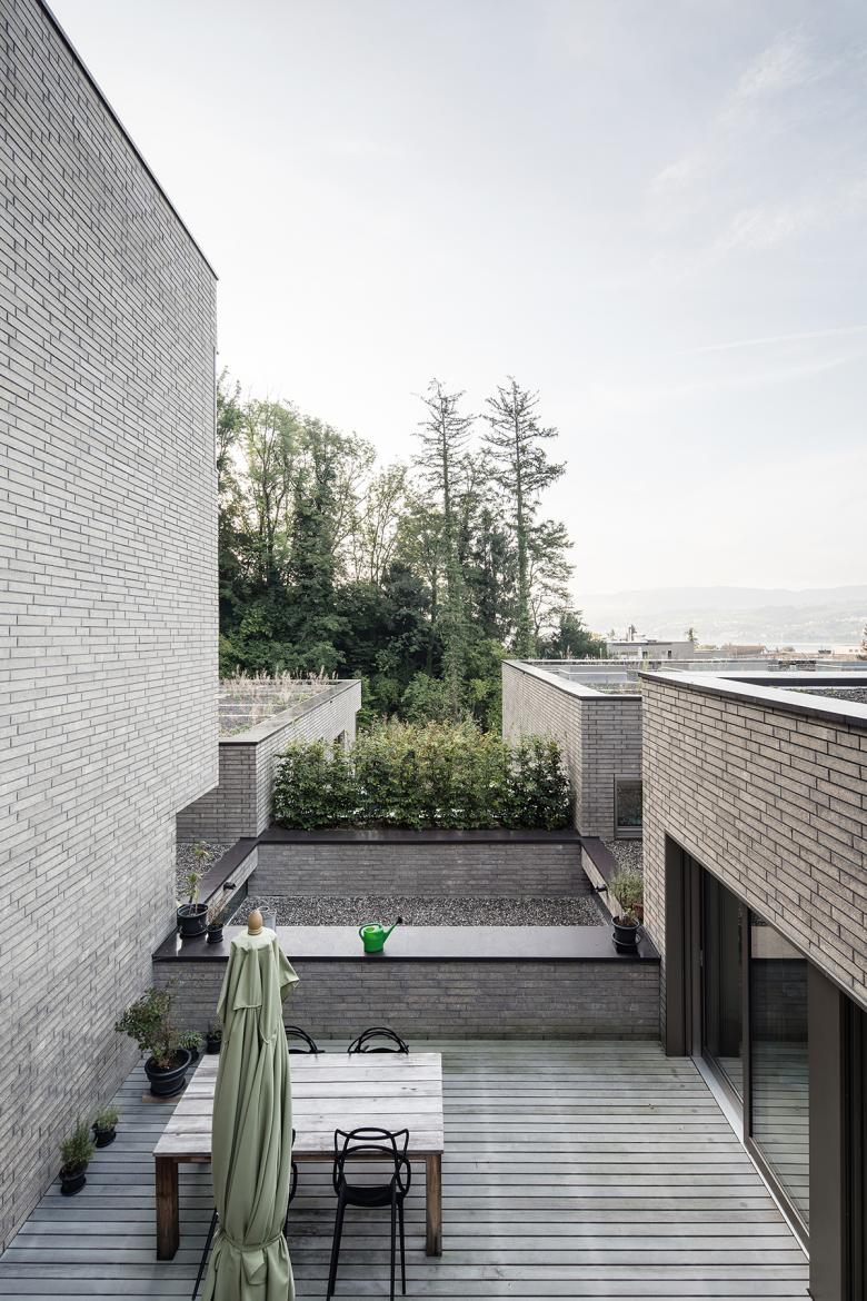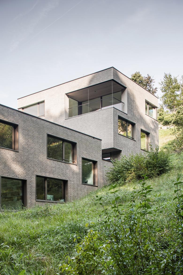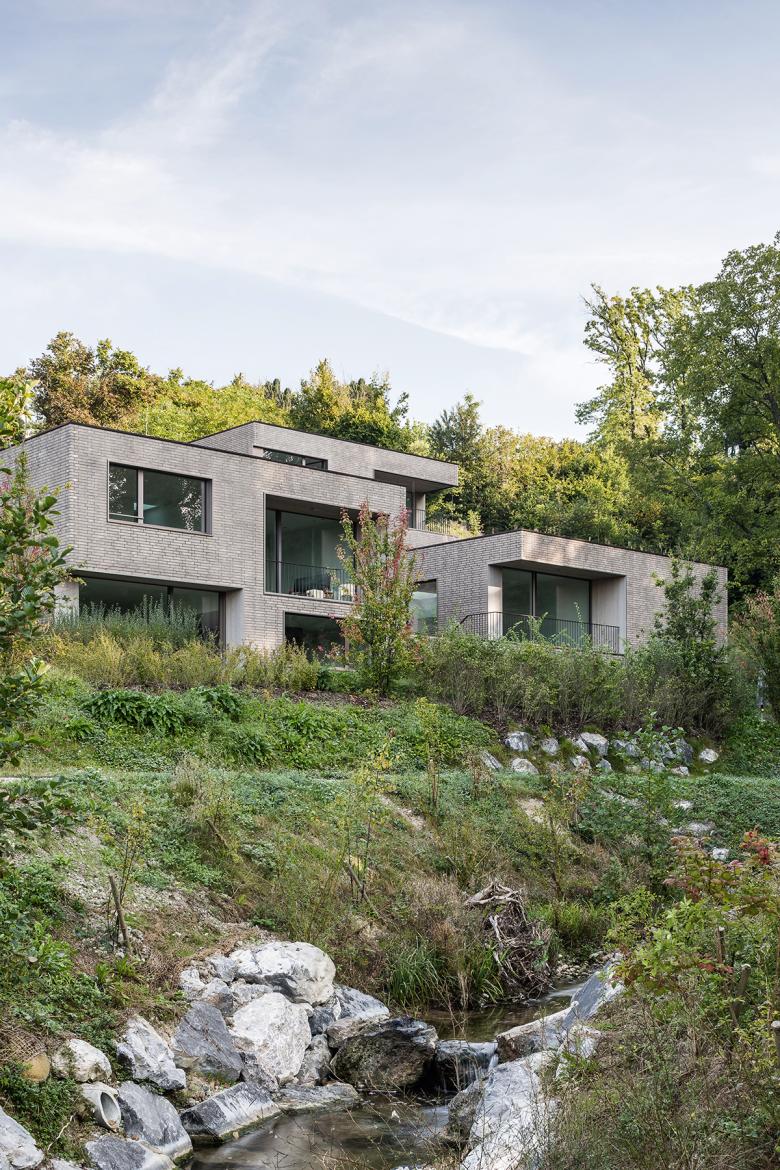 Die einzelnen Volumen des exklusiven Wohnhauses formen eine spannende räumliche Verschachtelung mit individuellen Sichtbezügen für jede der fünf Wohnungen und die überhöhten Räume mit leichten Niveausprüngen schaffen galerieartige Bereiche. Durch die grossen Glasflächen der Wohnräume wird die naturnahe Umgebung besonders intensiv erlebt. Kennzeichnende Elemente bilden die hochwertige Klinkerfassade mit horizontal geschichteten, groben Klinkerriemen sowie die versetzten Einschnitte und Niveausprünge an den Fassaden für die privaten Patios.
