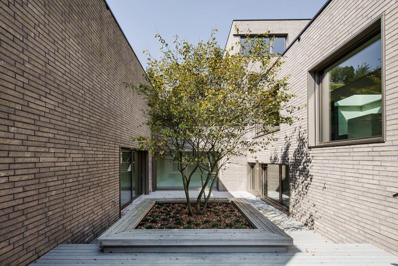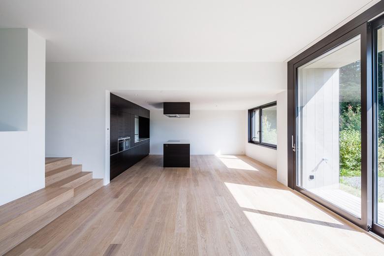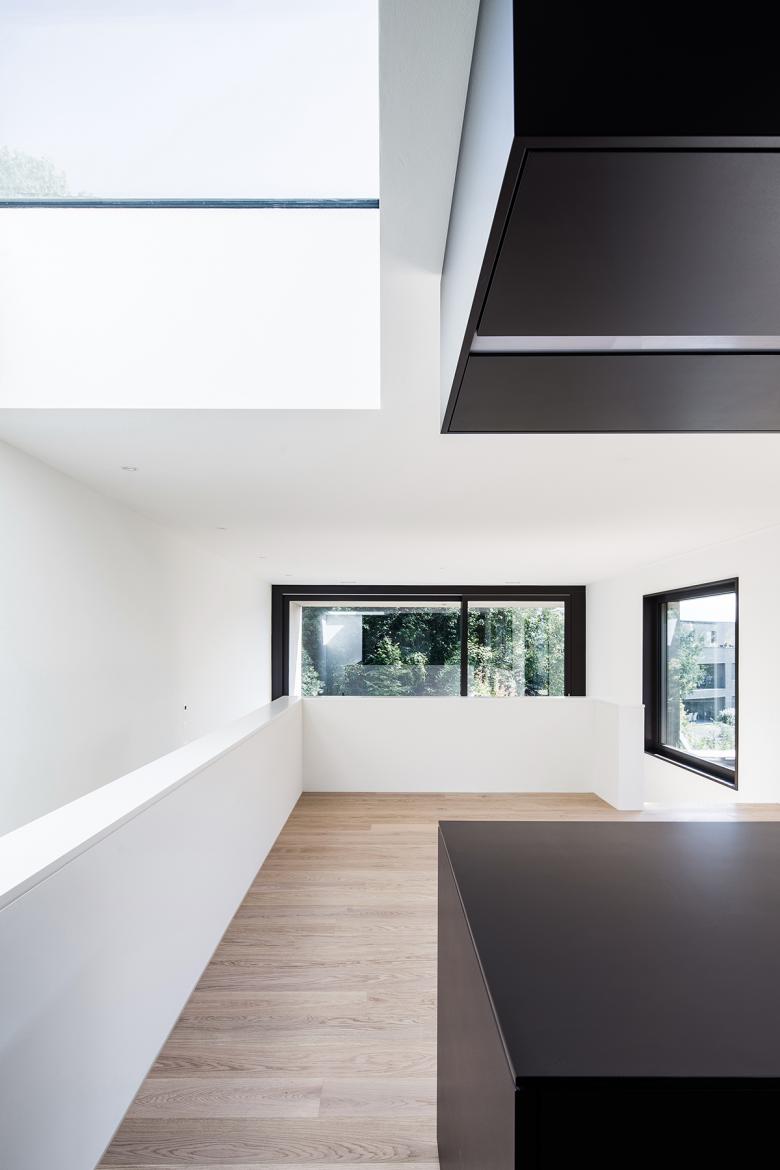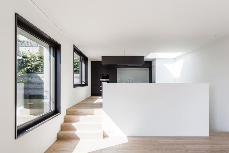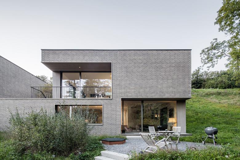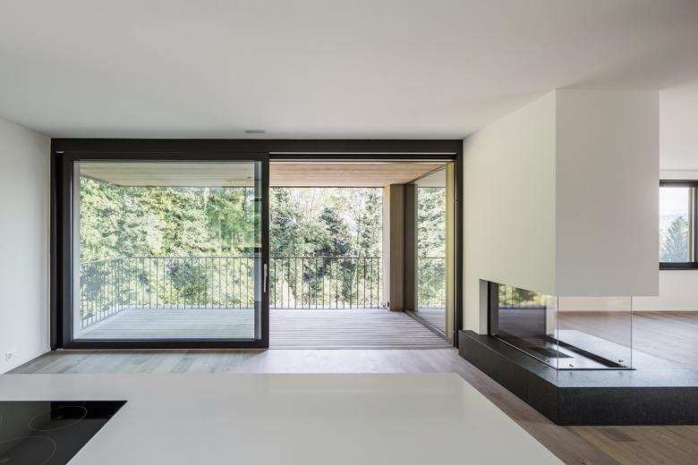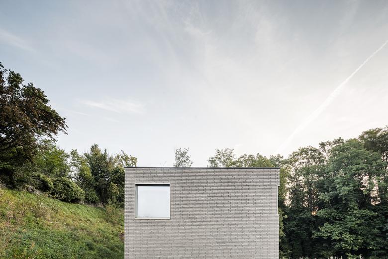 Die einzelnen Volumen des exklusiven Wohnhauses formen eine spannende räumliche Verschachtelung mit individuellen Sichtbezügen für jede der fünf Wohnungen und die überhöhten Räume mit leichten Niveausprüngen schaffen galerieartige Bereiche. Durch die grossen Glasflächen der Wohnräume wird die naturnahe Umgebung besonders intensiv erlebt. Kennzeichnende Elemente bilden die hochwertige Klinkerfassade mit horizontal geschichteten, groben Klinkerriemen sowie die versetzten Einschnitte und Niveausprünge an den Fassaden für die privaten Patios.