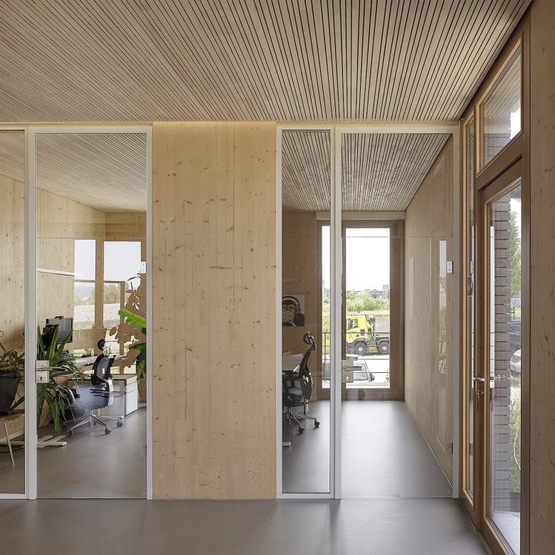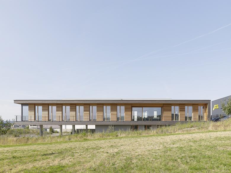 Holz als wesentlicher Baustoff bestimmt die Erscheinung sowohl im Äußeren wie auch im Inneren des Gebäudes. Die tragenden Bauteile wurden aus Massivholzwandelementen und aus Lignatur Hohlkörperdecken erstellt. Die bewitterten Fassadenflächen aus Lärchenholz erhielten einen dunkleren Lasuranstrich, die wettergeschützten Bereiche sowie alle Holzflächen im Inneren bleiben unbehandelt und erhalten damit ihren naturbelassenen Ausdruck. Die Wand- und Dachelemente wurden vorgefertigt und oberflächenfertig angeliefert und in sehr kurzer Zeit auf der Stahlbetondecke des Sockelgeschoßes montiert. Holzfenster ergänzen dieses nachhaltige Gebäudekonzept. Auch die Haustechnik orientiert sich daran – Fußbodenheizung, dezentrale Lüftungsgeräte mit Wärmerückgewinnung und eine Photovoltaik-Anlage über die gesamte Dachfläche sowie eine Wärmepumpe sind die Bestandteile einer energiesparenden Gebäudetechnik.