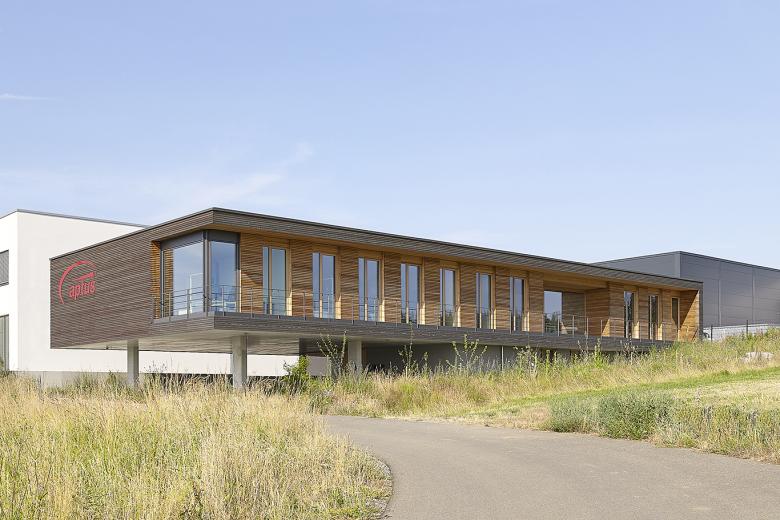 Das in Holzhybrid-Bauweise erstellte Bürogebäude des Backnanger IT Dienstleisters Aptus IT GmbH befindet sich am Rande des Gewerbegebietes Lerchenäcker in Backnang in einer Lage mit unverbaubarem Blick auf die umgebende Landschaft. Das Hanggeschoß in massiver Bauweise bildet den Sockel für den darüber liegenden Holzbau für die Büroräume. Der langgestreckte Baukörper „schwebt“ über dem Straßenniveau und lässt den zurückliegenden Eingangsbereich sehr gut erkennbar werden. Weitere Büroflächen hinter dem Gebäudezugang nutzen die Hanglage optimal aus. Das „Anheben“ der Aptus – Büros macht den Neubau gut erkennbar und bietet den meisten der 20 Arbeitsplätze eine freie Aussicht ins Grüne.
