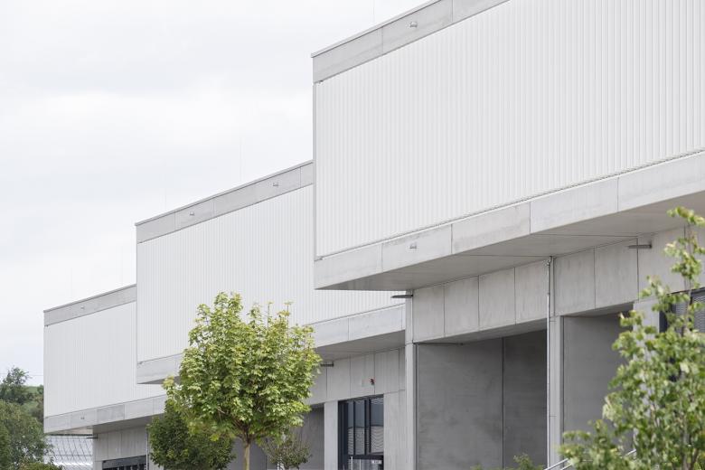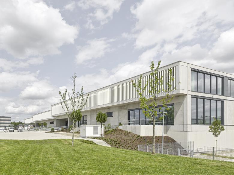 Der Gebäudekomplex besteht aus drei Hallenteilen mit vorgelagerten Bürobereichen. Die Büro-/Sozialräume, Empfang und Casino sowie Technikräume sind jeweils in zweigeschossigen Kopfbauten auf der Westseite der Hallen angeordnet. Die Räume im Obergeschoss besitzen durch eine Ganzglaswand eine Sichtverbindung zur Halle, welche auf direktem Weg über eine offene Treppe erreicht werden kann. Die äußere Erschließung erfolgt über die Raiffeisenstraße an der Westseite mit Zu- und Abfahrten für Anlieferverkehr an je zwei Überladebrücken und einer Rampe zu einem ebenerdigen Tor pro Halle. Der Stichweg aus der Siemensstraße erschließt die Ostseite des Grundstücks mit Hof und ebenerdigen Toren. Die Fassade der Hallen besteht aus Sichtbeton-Sandwich-Elementen und Isopaneelen in dunklem Farbton. Großflächige Verglasungen an den Außenseiten erzeugen helle Hallen-Innenräume.