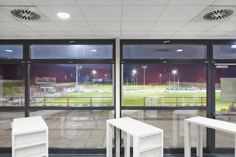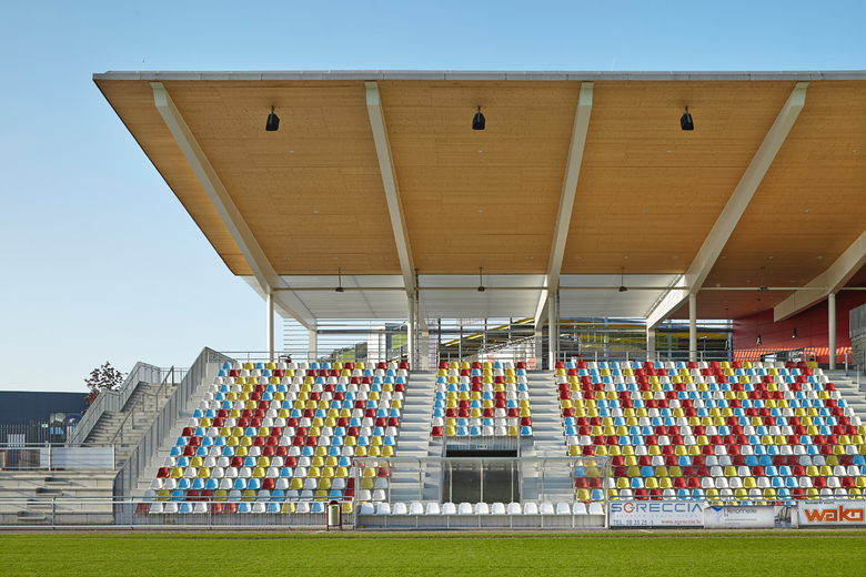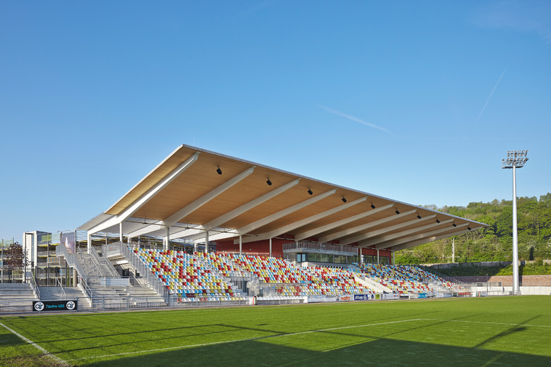 Für die Tribünenanlage wurde ein rechteckiger Grundriss gewählt, der sich nach Süden zur Straße hin geschlossen und nach Norden zu den Spielfeldern hin offen präsentiert. Um den Dialog zwischen dem Foyer bzw. dem Zuschauerbereich des Tribünengebäudes und dem öffentlichen Platz zu verstärken, wurde die geschlossene Fassade des Gebäudes an der Eingangsseite in eine Lamellenstruktur aufgelöst. Dies ermöglicht es dem Körper seine klare Geometrie zu behalten, ohne den Stadtraum zu beengen und gleichzeitig öffnet es die Sichtbeziehung zwischen dem Zuschauer und dem städtischen Raum.