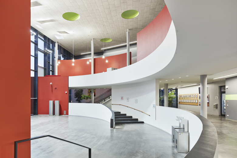 Die Schule ist in 3-geschossige Einzelhäuser gegliedert, die über eine gemeinsame Halle erschlossen sind. Die Halle ist das Herz der Schule. Hier bietet sich Raum für gemeinschaftliche Aktivitäten wie das gemeinsame Essen und für Gruppenarbeiten, aber auch ruhige Rückzugsbereiche für Einzelarbeit und Ruhephasen.