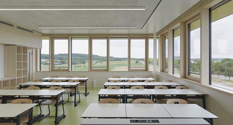 Das Schulzentrum wurde in Holzhybridbauweise errichtet: Während Sockel- und Erdgeschoss sowie die Treppenkerne in Stahlbeton ausgeführt sind, bestehen die Obergeschosse aus vorgefertigten Massivholzelementen (Brettschichtholzdecken, Brettsperrholzwände). Über 2.900 m³ Holz kamen zum Einsatz. Die hohe Vorfertigung ermöglichte eine trockene, schnelle Bauweise und reduzierte die Bauzeit erheblich.