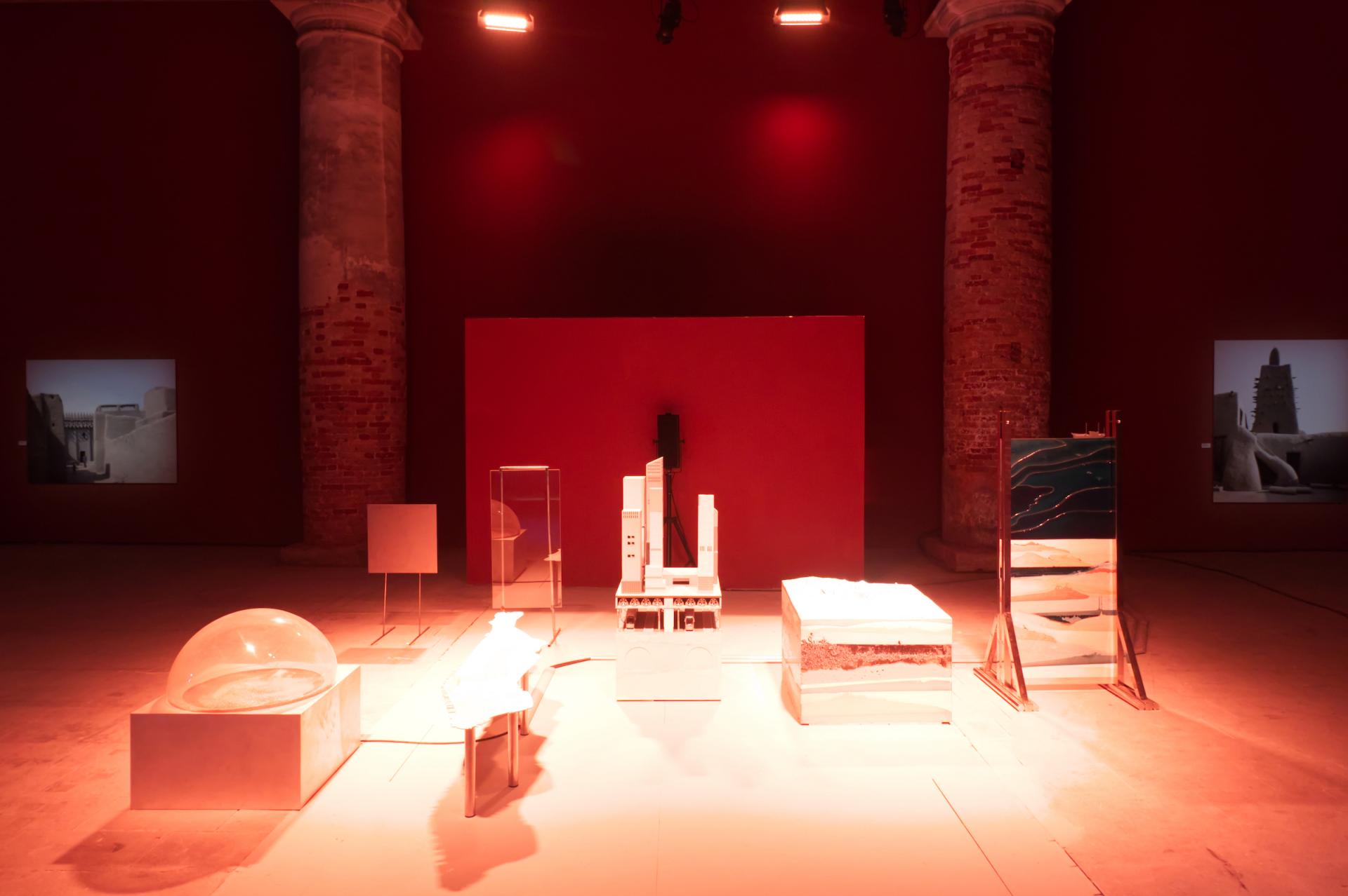 Further along the Corderie is Xholobeni Yards: Titanium and the Planetary Making Of Shininess/Dustiness, an immersive multimedia presentation by Andrés Jaque/Office for Political Innovation that focuses on the “transnational extractivism” of New York City's Hudson Yards. The title refers to the Xolobeni mine in South Africa, whose ilmenite deposits were used to create the reflective titanium cladding on skyscrapers such as those at Hudson Yards (organized community opposition means the mine is currently closed). Other minerals mined from the African continent — “chromite extracted from the earth of the Great Dyke of Zimbabwe” and “cobalt extracted from the Nyungu mines of Zambia” are two articulated in the catalog — are needed to give corporate developments like Hudson Yards its shine. But the titanium extracted from the ilmenite leaves in its place a dust that easily blows in the wind, an effect expressed by the red light bathing the installation at times.