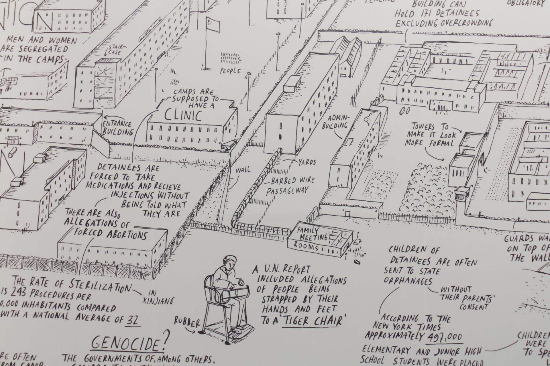 A few days after the Venice Architecture Biennale opened to the public on May 20, news broke that the “Chinese Embassy [had] dropped out of the influential international cultural exhibition due to a 30-minute documentary about the Xinjiang detention camps, blasting it as ‘fake news.’” The documentary, Investigating Xinjiang's Network of Detention Camps by Killing Architects, uses “visual and spatial methods such as satellite imagery, 3D modeling, and analyses of the Chinese prison building regulations” to conclude, from a distance, “that each site was a detention camp,” something the Chinese government refutes. The film takes place inside a room within the Arsenale, while a wall drawing on the outside (photo above) mixes architectural isometrics with descriptive notes and journalistic accounts.