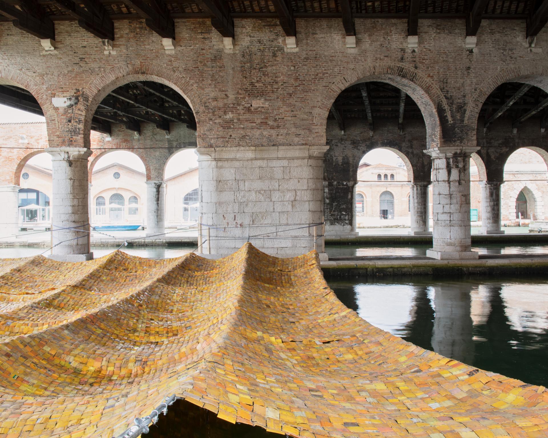 Many of the contributions to The Laboratory of the Future are not as straightforward as ACE/AAP. Visitors must have patience reading wall texts, watching films, and metaphorically scratching beneath the surface to find meaning and relevance in the exhibits. Two large pieces by the Studio of Serge Attukwei Clottey are on display, both taking the name Time and Chance: one hung on a wall in the long Corderie of the Arsenale and a more substantial site-specific piece suspended from the supports of the Gaggiandre (photo above). The yellow, fabric-like installations are made from discarded plastic containers that lend the Ghanian artists's series of works the name “Afrogallonism.” Beautiful from afar, when seen up close the components of the artworks — small squares stitched together in an un-self-conscious manner — clearly exhibit the objects from which they were made, with stickers, corrugations, and even bits of mold part of the expression. Tosin Oshinowo's essay in the exhibition catalog, though not mentioning Clottey, resonates with his work: “As the rest of the world faces similar scarcity challenges [to Africa] due to our urgent climate crisis, the continent's resilience is a case for an alternative approach.”