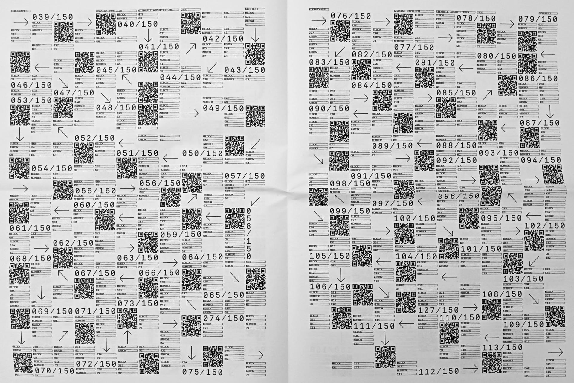 As an addendum to the lesson learned about films, it should be noted that many of the national pavilions rely heavily on QR codes, pointing visitors to websites with architectural projects and other things only partly displayed in the pavilions. While the national pavilions do not need to follow the theme of the main exhibition, they do need to abide by the Biennale's environmental sustainability rules now in place. Nowhere is a shift from artifacts to films and QR codes more apparent than in the Spanish Pavilion, FOODSCAPES, which consists of “five short films; an archive in the form of a recipe book; and a public program of conversations, debates, events and collective research.” The films are found in small darkened galleries off the central space, whose walls are covered with large photographs accompanied by QR codes, many of them out of reach. A newsprint allows visitors to scan the codes — all 150 of them — that lead to single-page PDFs with images, titles, and credits on the various “foodscapes.”
