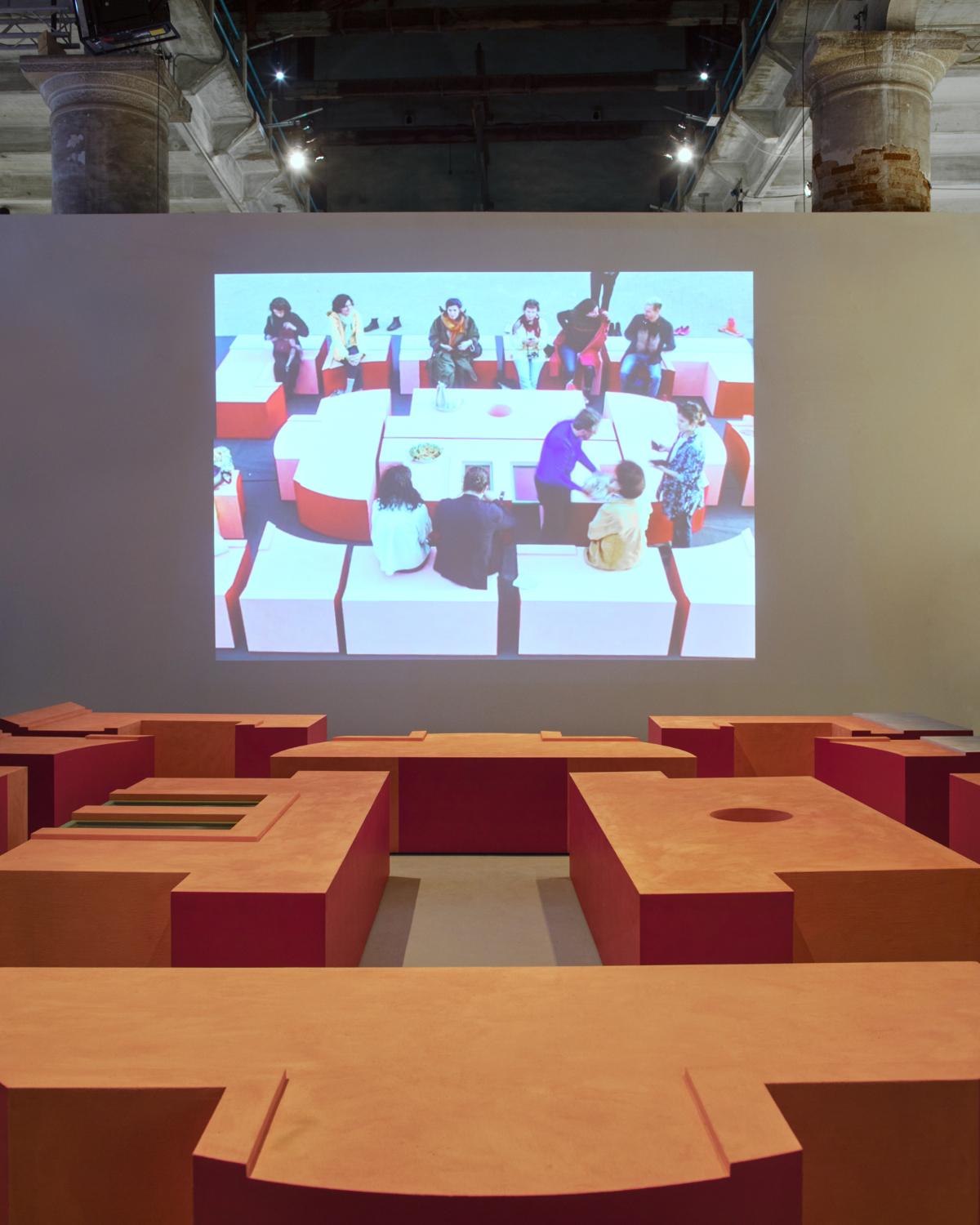 Veränderung ist ein Prozess, und ein solcher braucht definitionsgemäss Zeit. Diese Zeit sollte man sich auch als Besucher*in nehmen, denn mal eben schnell kann man die im Hauptpavillon der Giardini und im Arsenale dargebotenen Inhalte nicht konsumieren. Dass Saaltexte zu einer Biennale gehören, ist nichts Ungewöhnliches, aber diesmal schien es, als müsse man genauer hinschauen. Vielleicht lag es auch bloss an der Länge der Texte, der unvorteilhaften Beleuchtung oder an der zu kleinen Schriftgrösse. Zeit also, sich einem Film zu widmen, dachte ich mir. Fast ein Drittel der 89 Beiträge besteht aus Filmen oder nutzt dieses Medium. Das hängt damit zusammen, dass das Briefing der Kuratorin unter anderem darin bestand, möglichst ressourcenschonende Formate zu nutzen. Zudem versuchte man, möglichst viele Teile der Szenografie der letztjährigen Kunstbiennale wiederzuverwenden sowie die Teilnehmenden dazu anzuregen, umweltfreundliches Material einzusetzen.