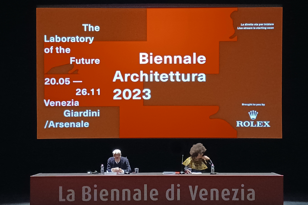 Lokko then touched briefly on the guiding framework of the exhibition — decolonization and decarbonization — in terms of the physical makeup of the exhibits (“screens, films, projections, and drawings in place of models and artifacts, wherever possible”) and the aims of their content: “The intention is not to replace, but to augment; to expand, not to contract; to add, not subtract.” Finally, just a short twelve minutes after beginning her remarks, Lokko wrapped up her remarks by reading a letter she wrote following her appointment as curator: