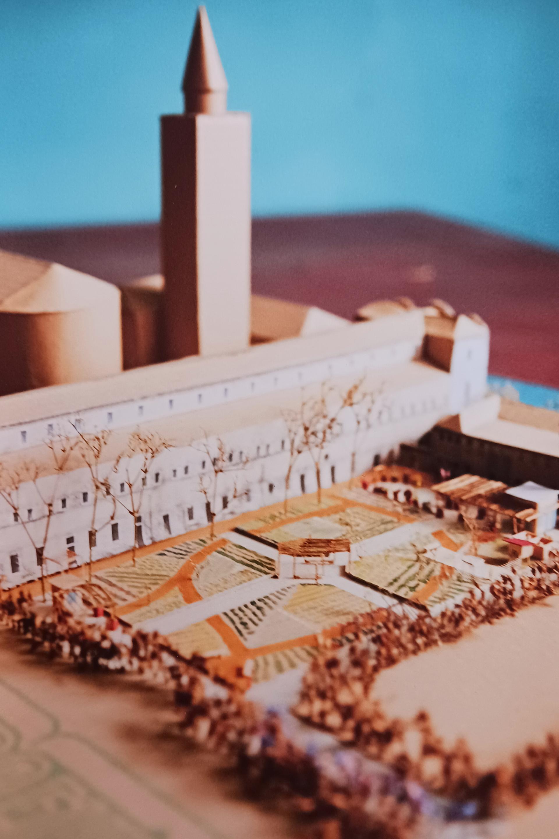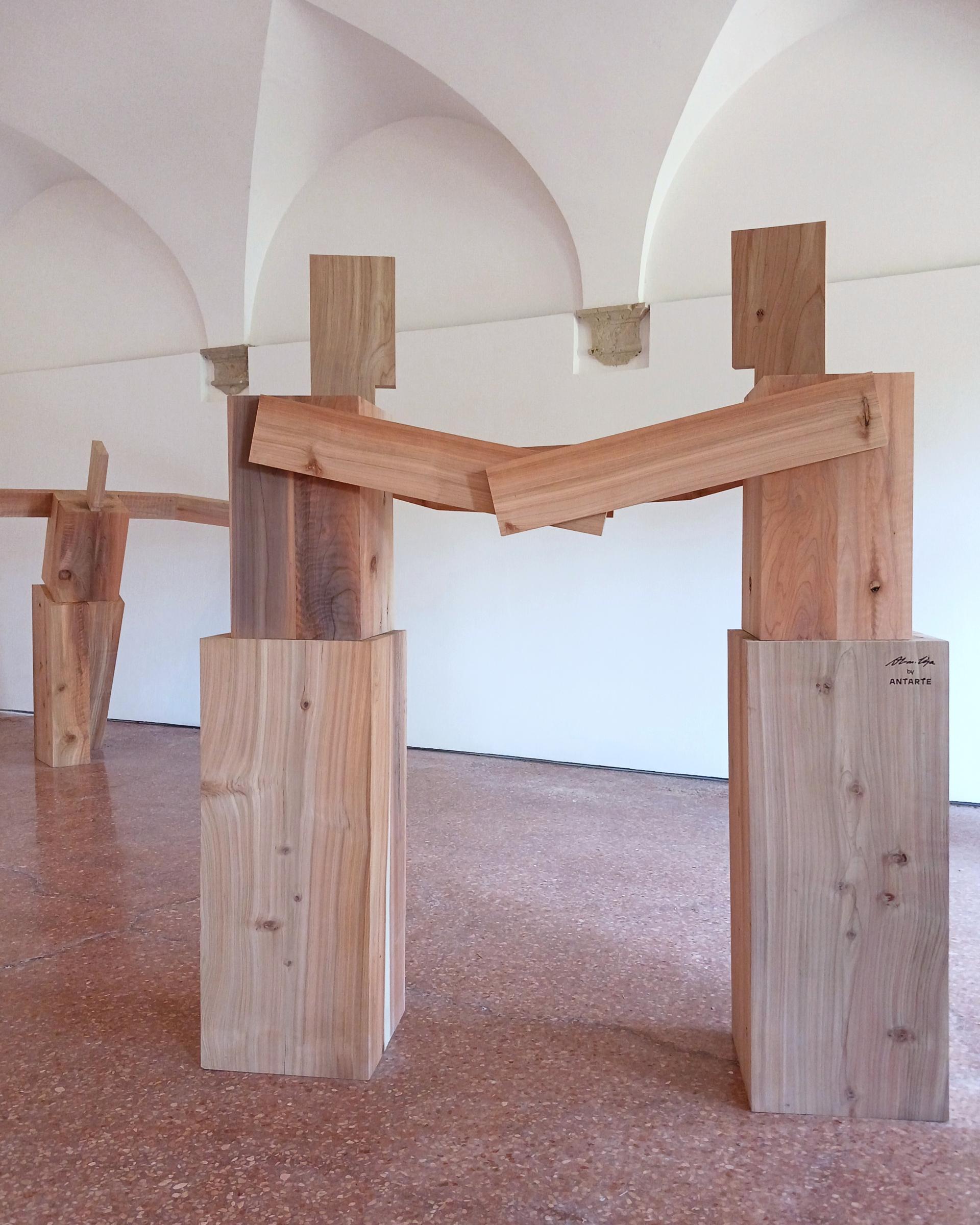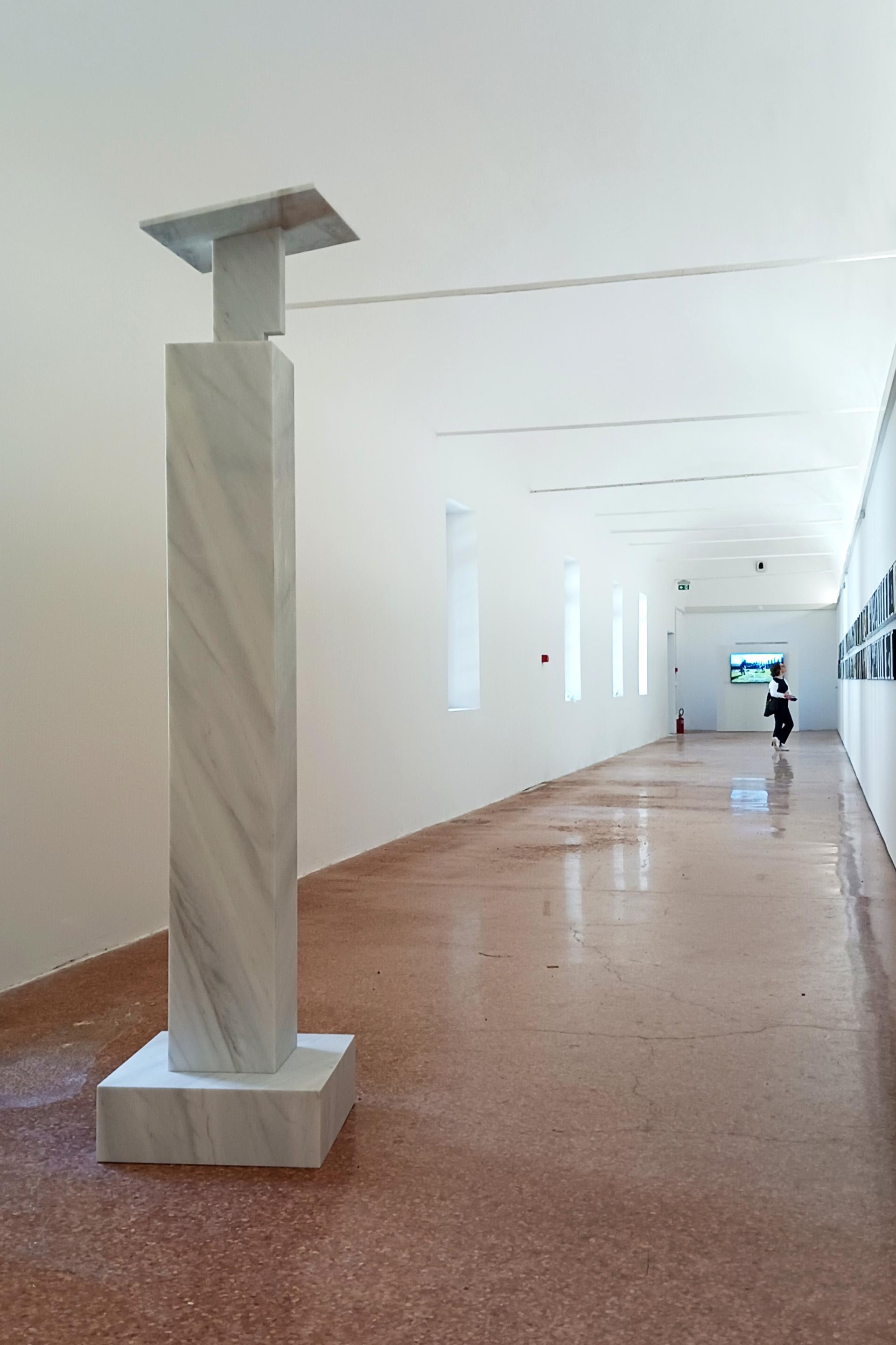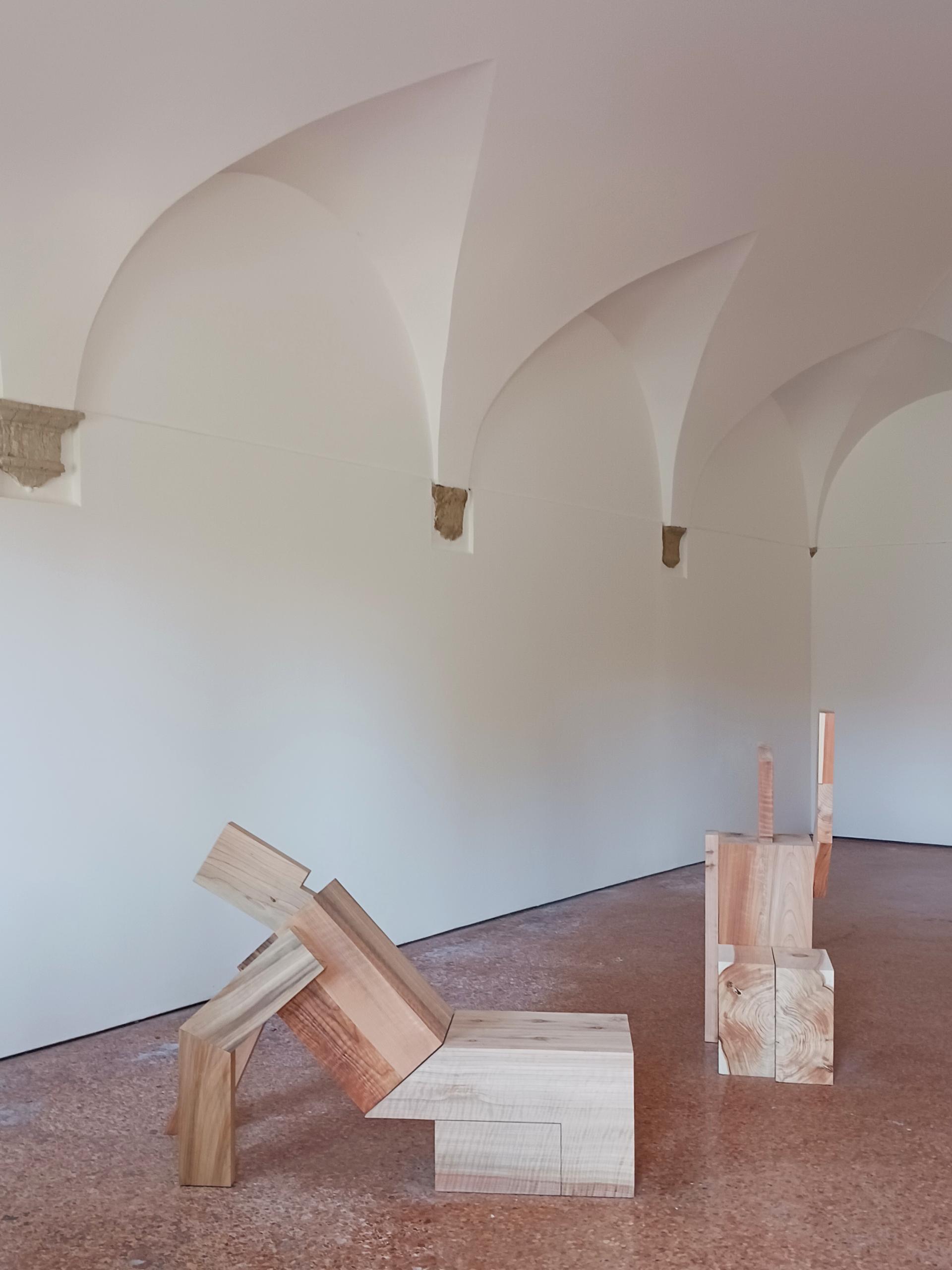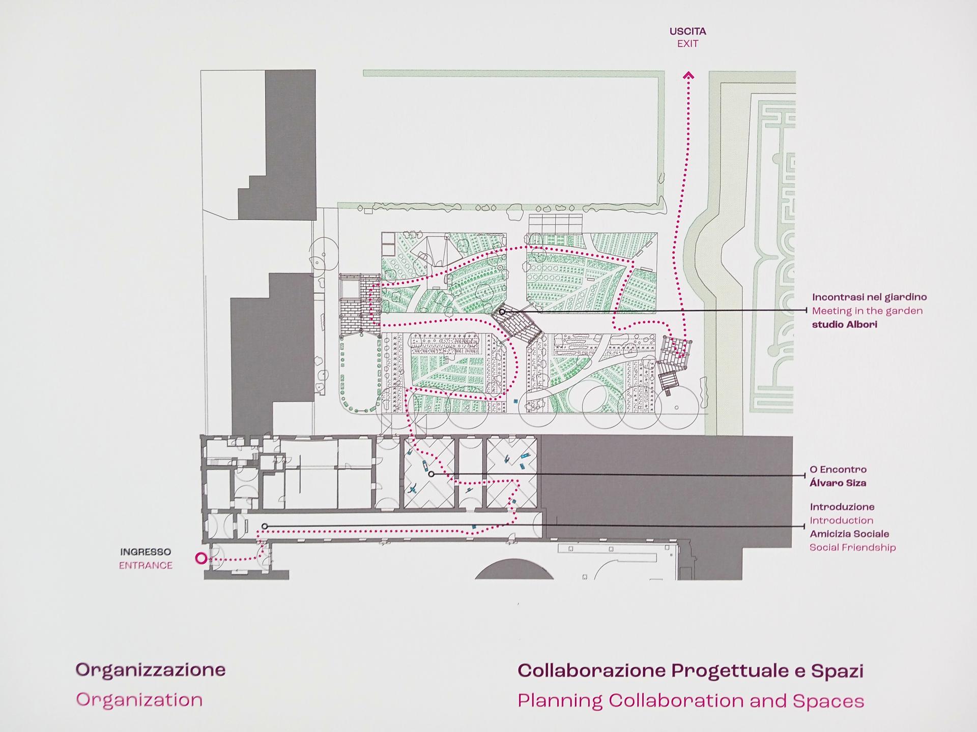 The Holy See Pavilion was curated by architect Roberto Cremascoli, who previously curated the 2016 Portuguese Pavilion with Nuno Grande; that pavilion also involved Álvaro Siza but was located on the island of Guidecca (Portugal does not have a permanent pavilion, such that this year it is located in Palazzo Franchetti near the Accademia Bridge). Cremascoli laid out the Holy See Pavilion so visitors walk down a long gallery in the abbey with photographs and other illustrations that reveal the process of Siza's installation, O encontro (The Encounter), and Studio Albori's garden. Following the intended route (see plan above), visitors then encounter Siza's sculptures (“Social friendship”) in a trio of rooms before heading outside and experiencing Studio Albori's interventions in the garden (“meeting in the garden”).