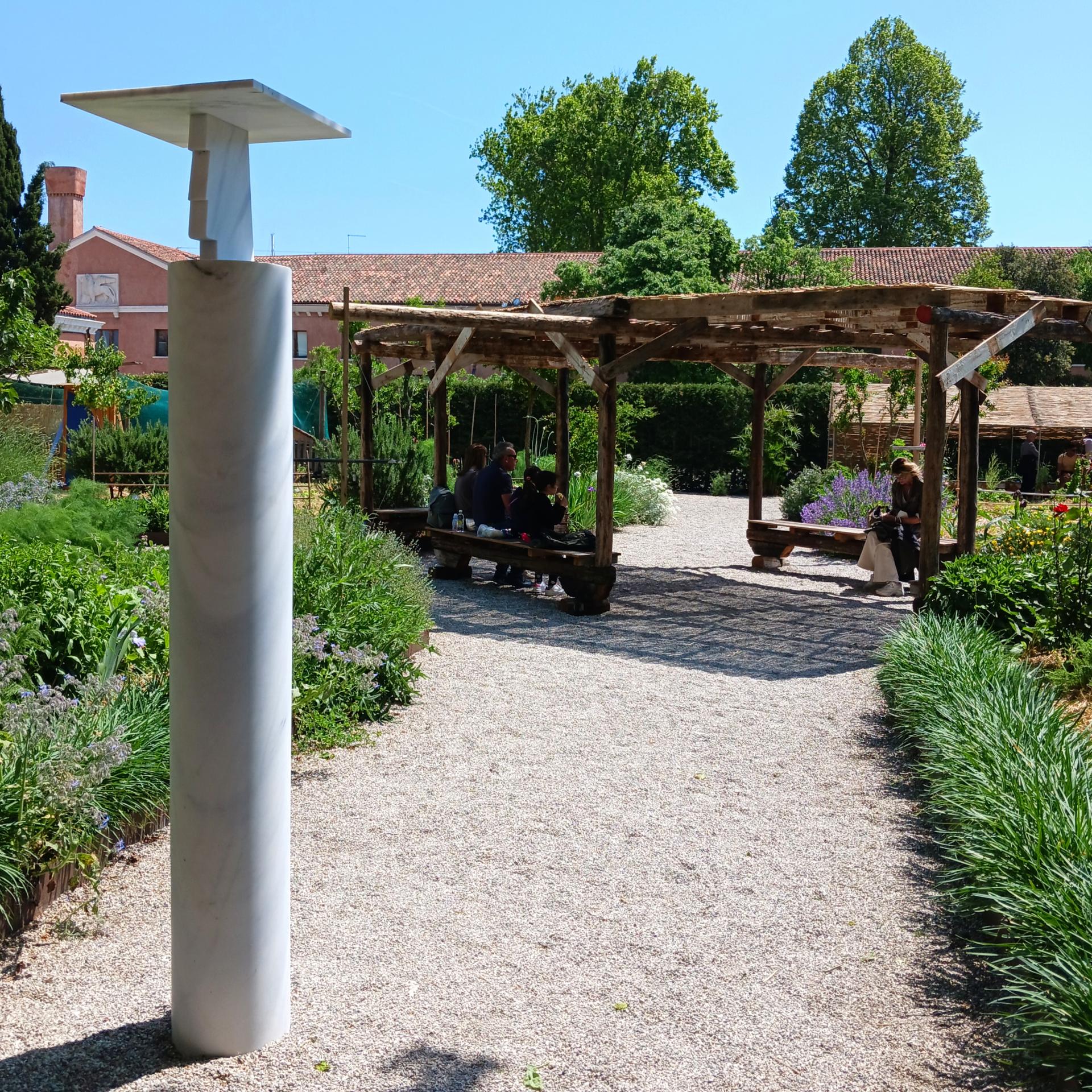 The theme's execution is articulated by Mirko Zardini, who was, per a Holy See press release, “responsible for the scientific project ‘Social friendship: meeting in the garden’”: “At a time, and on an occasion such as the Venice Architecture Biennale, when architecture's presence is often linked more to words than to deeds, we preferred to propose some modest actions, to initiate processes, to present concrete facts such as cultivating a vegetable garden, reusing materials, creating a place for conversations. Not a proliferation of words or activities, but a place of pause and quiet, of silence, where to reflect on how, and from where, to start again.”