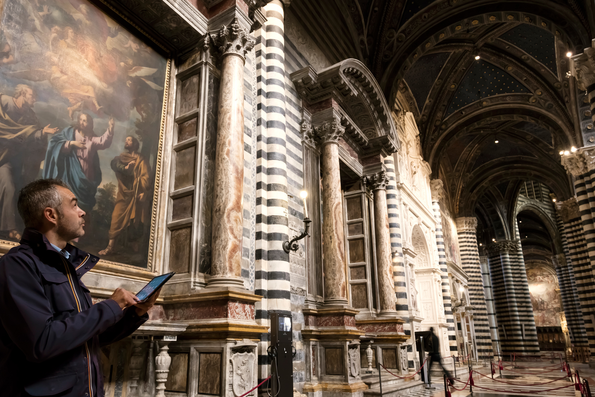 Weite Distanzen und hohe Anforderungen des Denkmalschutzes spielten ebenfalls bei der Planung der neuen Innenbeleuchtung des Doms von Siena eine zentrale Rolle. Die gotische Kathedrale beherbergt historische Bodenmosaike aus Marmorplatten mit aufwendigen Intarsien und Gravuren. Durch eine neue Beleuchtung sollten die insgesamt mehr als 50 Mosaikfelder wirkungsvoll zur Geltung gebracht werden. Die Herausforderung: Die Leuchten sollten in einer Höhe von über 25 Metern steuerbar sein, um das Licht auf die Atmosphäre im Dom abzustimmen. Die Bestimmungen des Denkmalschutzes schlossen dabei eine zusätzliche Verkabelung aus. ERCO entwickelte daher eine Steuerungslösung, bei der sich die eingesetzten Stella und Parscan Strahler nun drahtlos über Casambi-Bluetooth per Tablet steuern, dimmen und für verschiedene Nutzungsszenarien programmieren lassen.