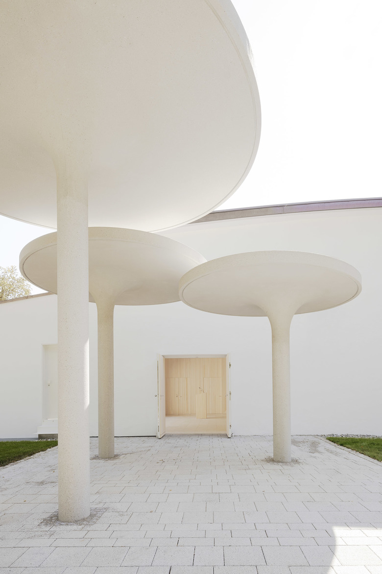 Für die Aussegnungshalle ergibt sich so eine neue Differenziertheit und Vielfältigkeit der räumlichen Wahrnehmung, die je nach Standpunkt, Blickwinkel und Lichteinfall variiert.