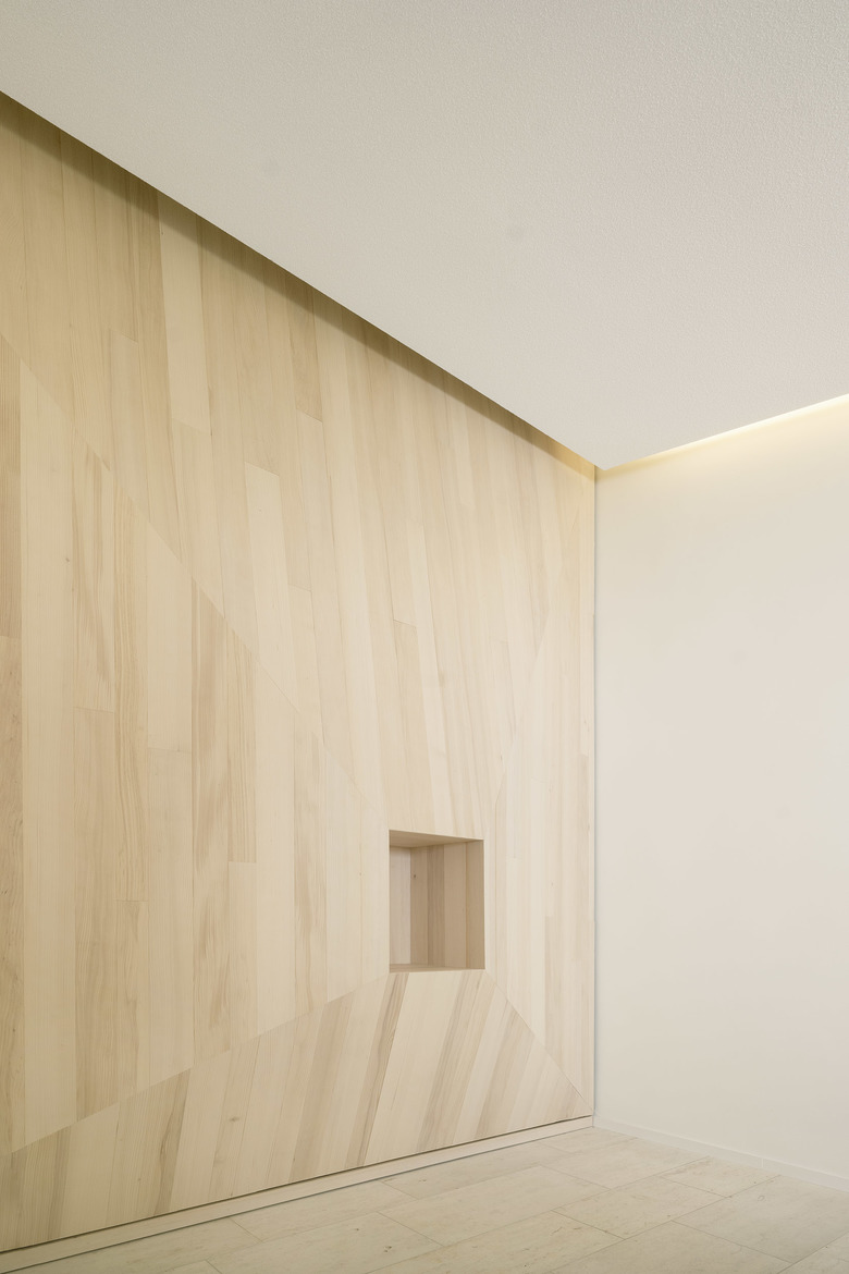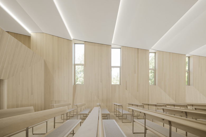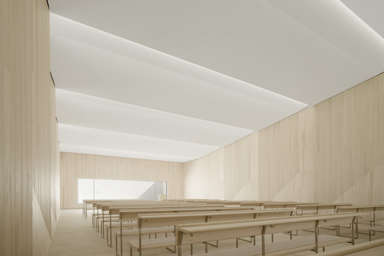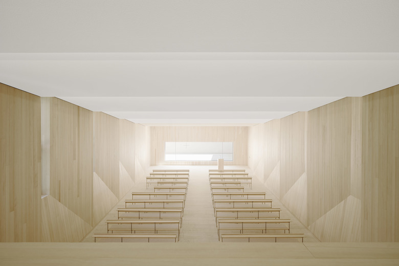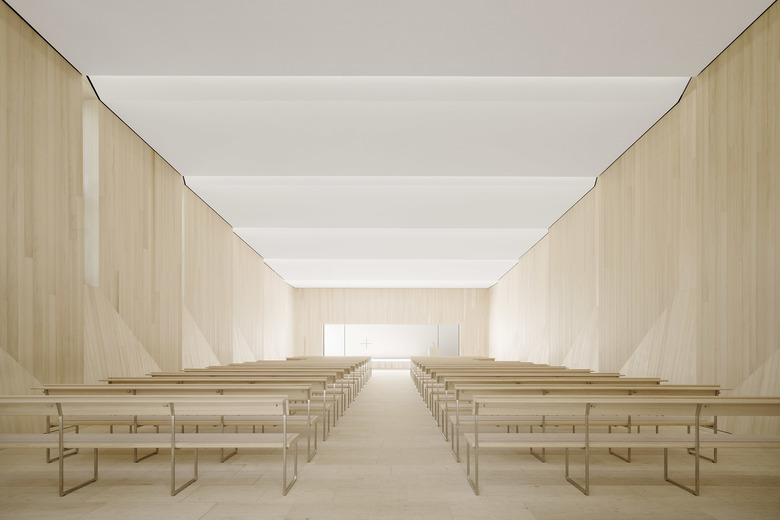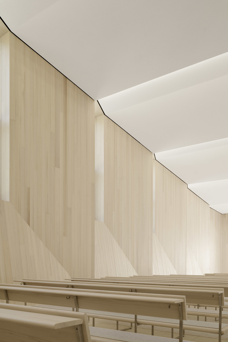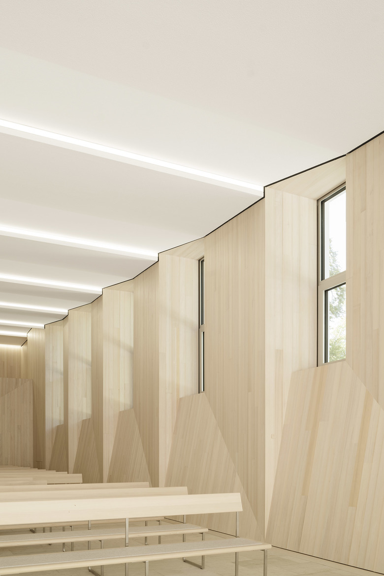 Die Wände sind mit einer neuen hölzernen Schale aus massiven Weisstannenbohlen bekleidet. Die plastische Ausformulierung der Wandgeometrien leitet sich aus der Tragstruktur des Gebäudes und den vorhandenen Wandöffnungen ab. Gleichzeitig ist sie Sinnbild für die fein austarierte räumliche Balance aus Leichtigkeit und Schwere, die bei einer Vielzahl von historischen Sakralbauten zu finden ist. Die Materialität aus heimischem Nadelholz umhüllt die Abschiednehmenden in einem die Sinne berührenden hölzernen Kleid.