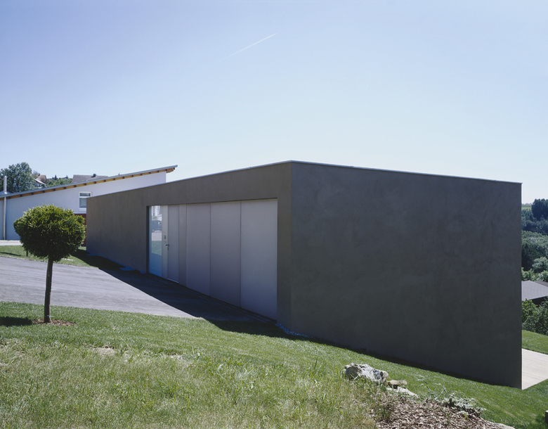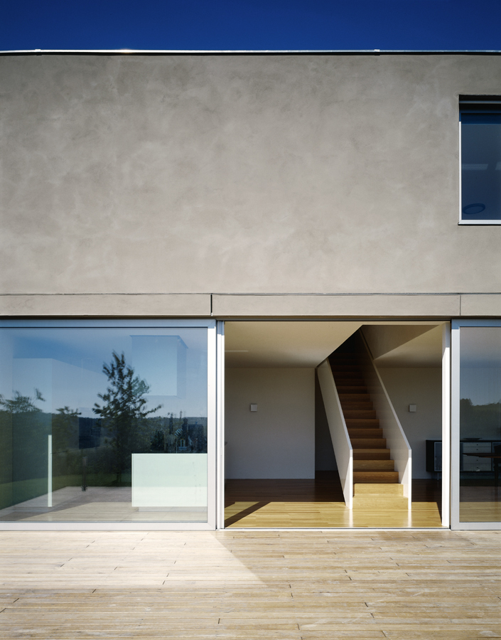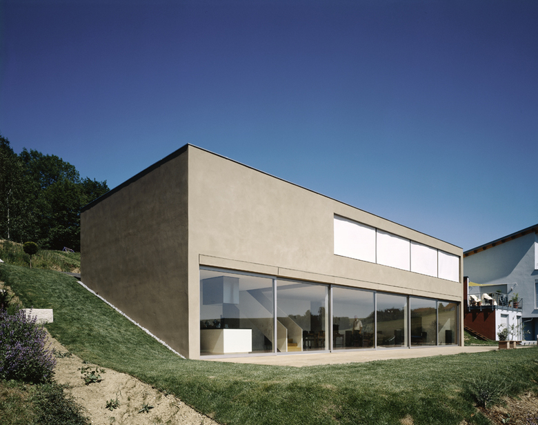 Eine aussen isolierte Betonkonstruktion, verputzt mit einem handwerklich aufgetragenen Kalkputz und mineralischem Anstrich ist Ausdruck der Erdverbundenheit, ein einfacher Kubus im Dialog mit der Natur. Innen bilden verputze Wände, Eichenparkett und weiss lackierte Einbaumöbel den Rahmen für das Familienleben.