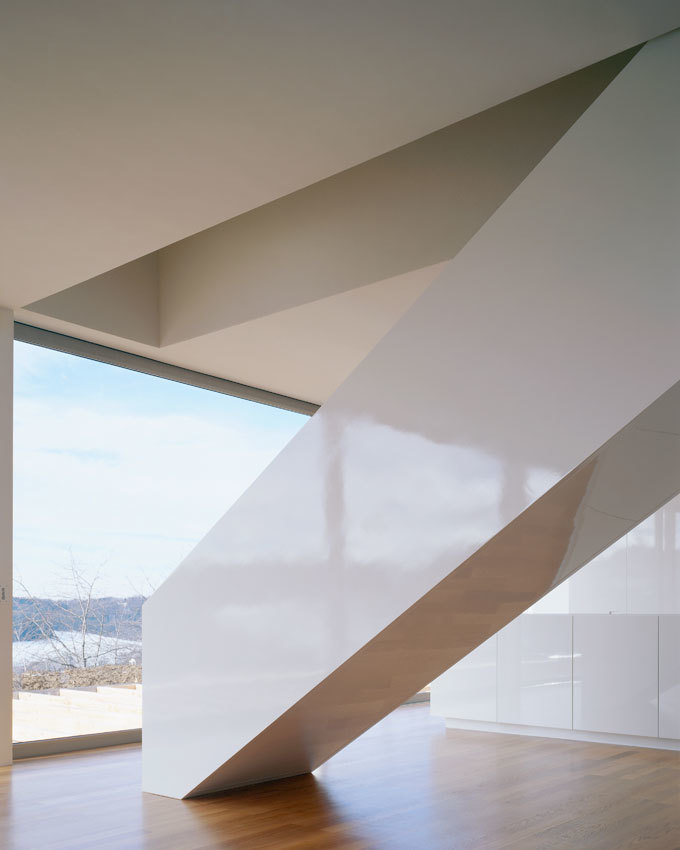 Ein Körper, verwurzelt mit der Erde, stemmt sich gegen den Hang, wird von ihm umspült und öffnet sich talseitig. Alles richtet sich aus nach Süden – Flugzeugpanorama. Die räumliche Konzeption ist wesentlich: Rückzugsbereiche für Eltern und Kinder im Eingangsgeschoss, eine gangway nach unten ins Weite, ein Raum für Kochen, Essen und Wohnen mit freiem Blick über die Landschaft.