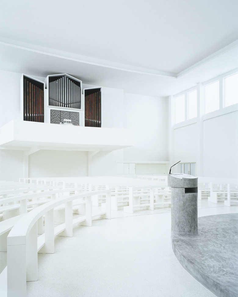 Im Rahmen der obligatorischen Renovierung haben die Architekten den Kirchenraum neu konzipiert, um eine dichtere und direktere Atmosphäre zu schaffen, ohne dabei den ursprünglichen Raum aufzugeben. Mit einer neuen Wandschale wurde das Kirchenschiff vom Chor getrennt, so dass ein Raum für einen Gottesdienst mit 300 Menschen und einer für eine Andacht mit 50 Menschen entstanden ist. Hatte früher ein Absatz den Chor und damit den Altar auf Distanz zum Kirchenschiff gehalten, so ist in der neuen Raumformation diese Trennung aufgehoben, der Altar ist in die Mitte der Gemeinde gerückt, ohne dass die achsiale Struktur ganz hätte aufgegeben werden müssen. Die gekrümmte Wandschale mit dem eingeschnittenen Kreuz unterstützt die Wirkung der mit der neuen Anordnung erzeugten, schützenden Umschließung. Aber auch die Rückseite der neuen Wand ist konkav gekrümmt, sie erwidert die Form der äußeren Chorwand.