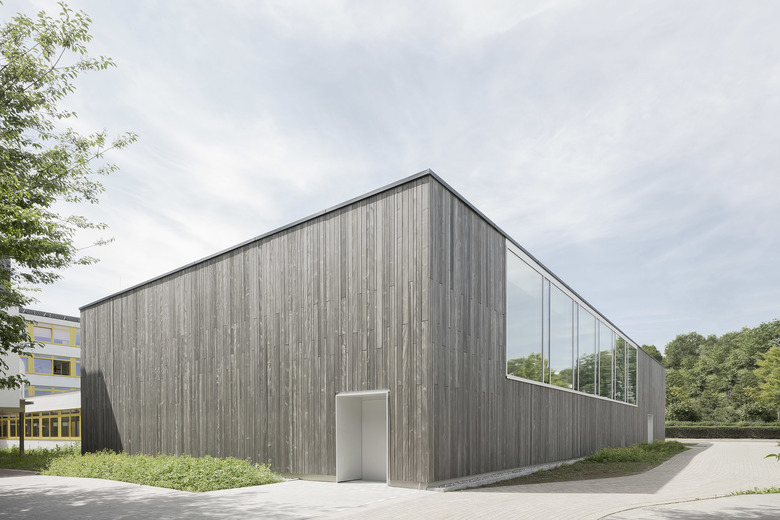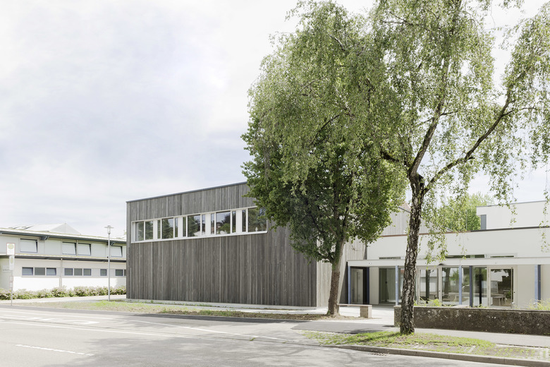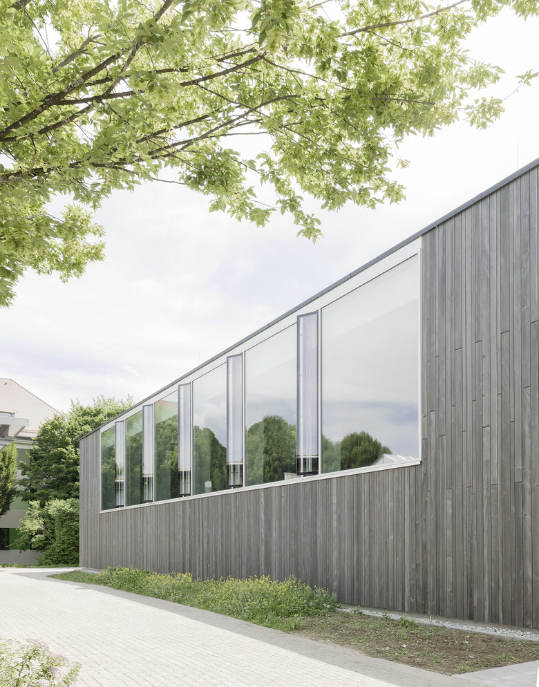 Durch eine homogene, vertikal angeordnete und hinterlüftete Holzverkleidung aus Weisstanne wird die Körperhaftigkeit des bestehenden Volumens gestärkt. Gleichzeitig konnten gezielt gesetzte neue Öffnungen realisiert werden. Eine großformatige Verglasung an der Nordseite der Halle ermöglicht eine natürliche, blendfreie Belichtung, ein außenliegender Sonnenschutz ist nicht notwendig. Integrierte Öffnungsflügel im Stützenbereich sichern die natürliche Nachströmung von Frischluft. Gemeinsam mit Lüftungsklappen auf der Südseite der Halle ist eine wirksame Nachtlüftspülung gewährleistet, auf eine Lüftungsanlage in der Halle konnte verzichtet werden. Lediglich die Umkleide- und Duschbereiche erhalten eine kontrollierte Lüftung.