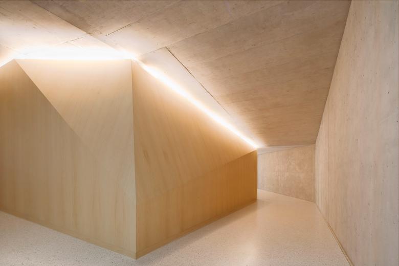 Sichtbeton an Stützwand und Decke, Terrazzo mit regionalen Zuschlagstoffen am Boden sowie eine warme hölzerne Schale aus heimischer Weißbuche prägen die innere Gestalt.