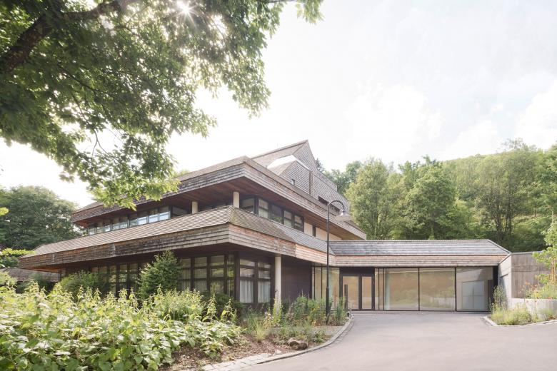 Unser Ansatz für das neue Zweckbauwerk ist das Ergebnis dieser vielfältigen Rahmenbedingungen. Eine Stützwand in polygonaler Abwicklung hält den Hang zurück und knüpft an funktional sinnvollen Stellen an die Bestandsgebäude an. Im östlichen Bereich ist die Anlage erdüberdeckt, eine Überfahrung für Feuerwehr und Traktoren gewährleistet. Nach Westen öffnet sich die talseitige Fassade zu einem neuen, ebenerdigen und einladenden Foyer.