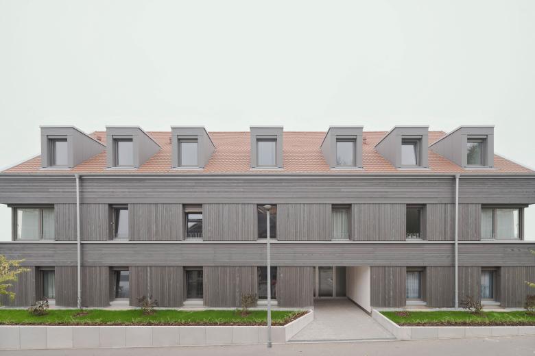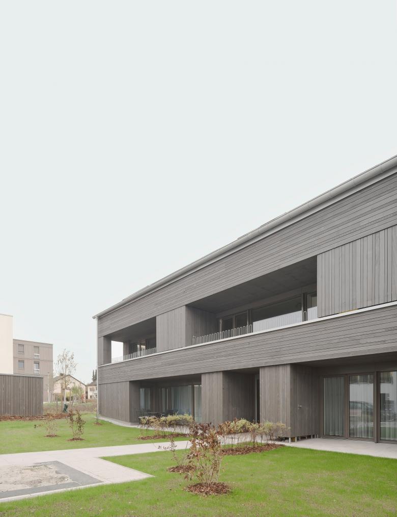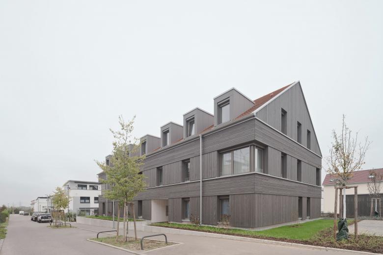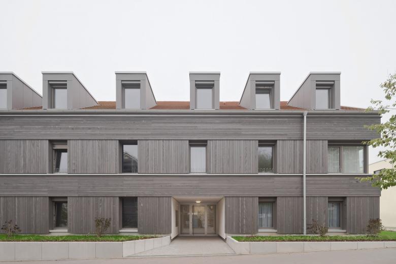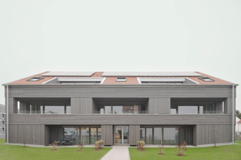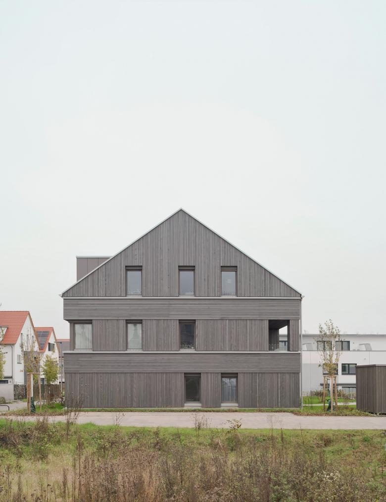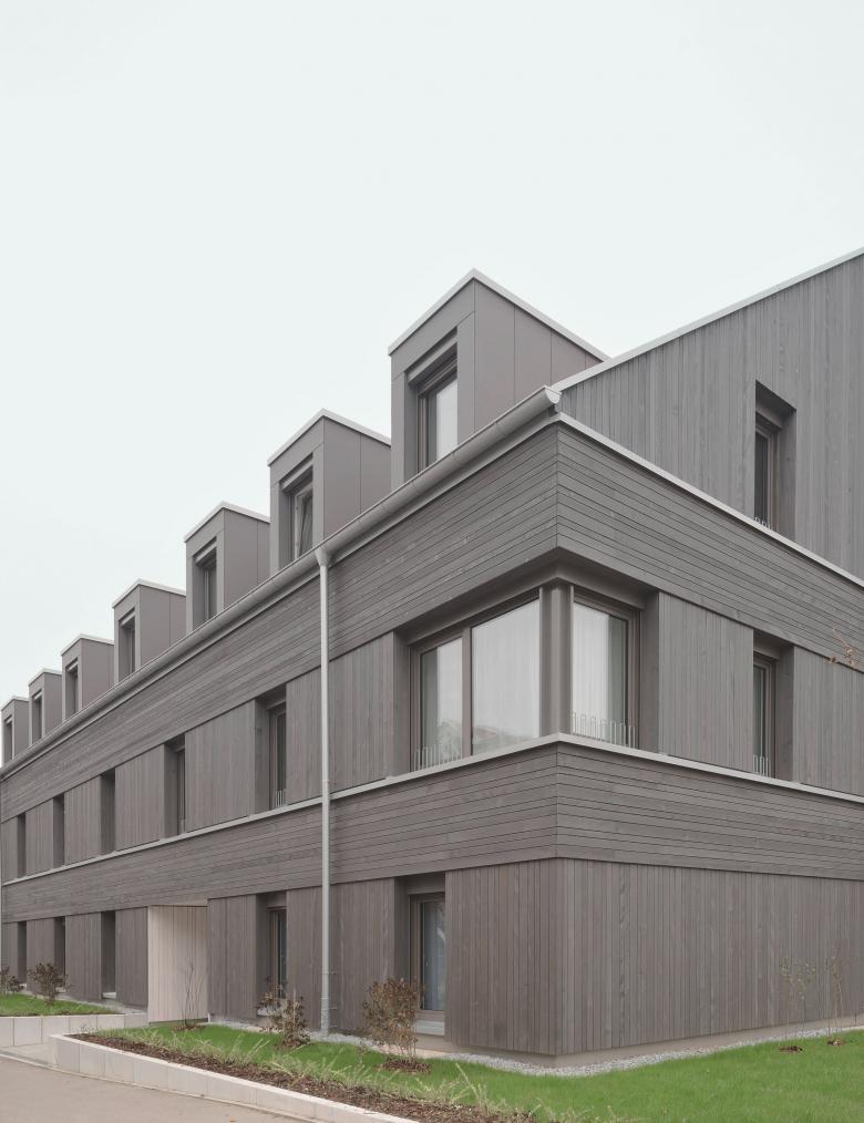 Hochgedämmte Holzfassaden mit hinterlüfteten, vorvergrauten Weisstannenschalungen bilden eine nachhaltige Fassadenbekleidung. Im Zusammenspiel mit Luft-Wärmepumpen und Photovoltaik erfüllen die Gebäude den KfW55-Standard.