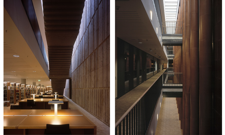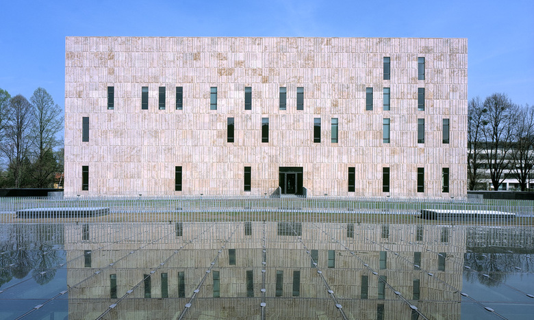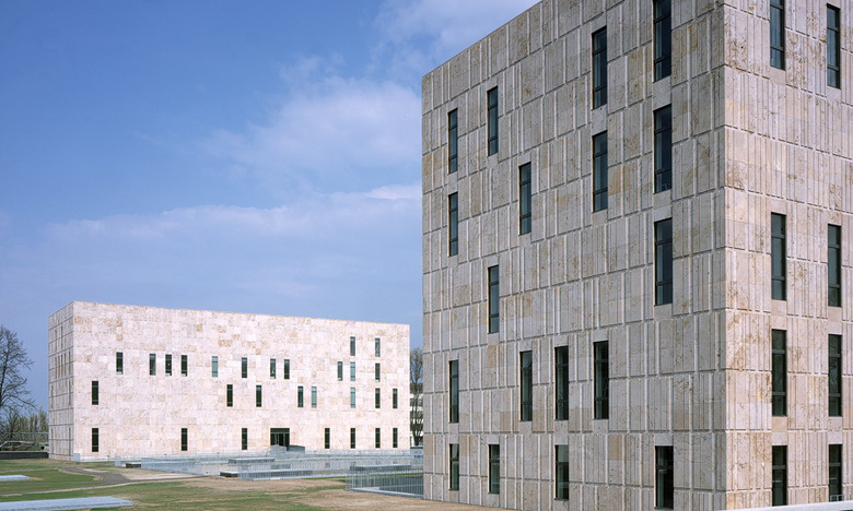 Sächsische Landesbibliothek Staats- und Universitätsbibliothek – Mit der Zusammenführung der Sächsischen Bibliotheken von Staat, Land und Universität ist hier eine Bibliothek von europäischer Bedeutung entstanden. Über sieben Millionen Bücher und Datenträger werden hier gespeichert. Der Bau selbst zeigt sich mit zwei gleichgroßen Steinquadern, die einander gegenüber auf einer Rasenfläche liegen. Mittig dazwischen befindet sich, in gleicher Größe wie die Grundfläche der Kuben, eine bündig in den Rasen eingelassene Glasfläche, das Oberlicht des zentralen Lesesaals. Dieser Lesesaal ist das Herzstück des drei-geschossigen Bibliotheksockels, der sich unterhalb der Rasenfläche über die gesamte Fläche des früheren Sportplatzes erstreckt.