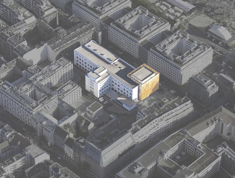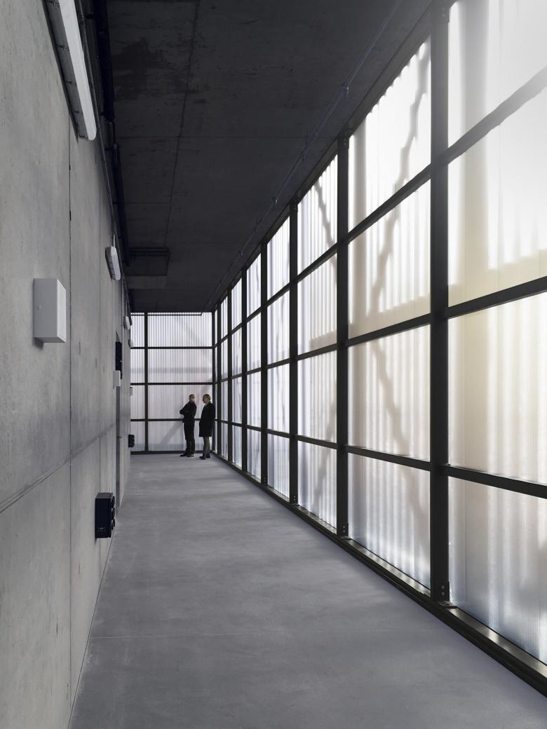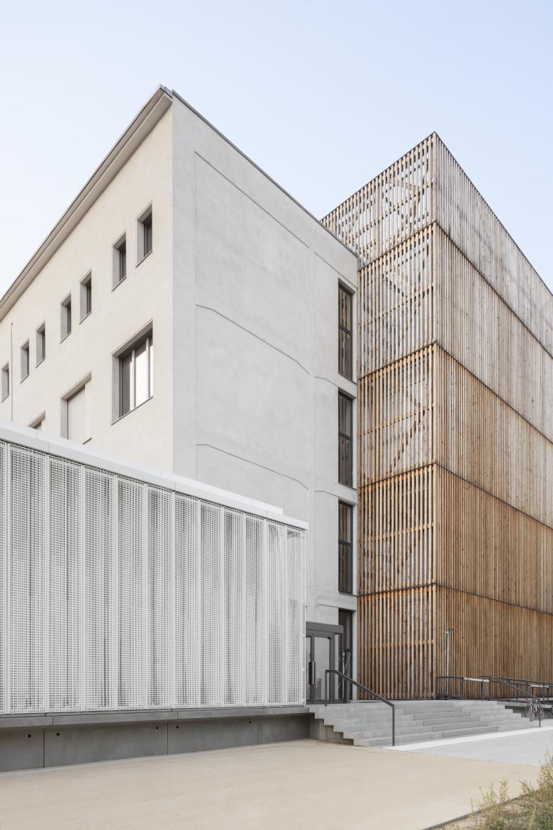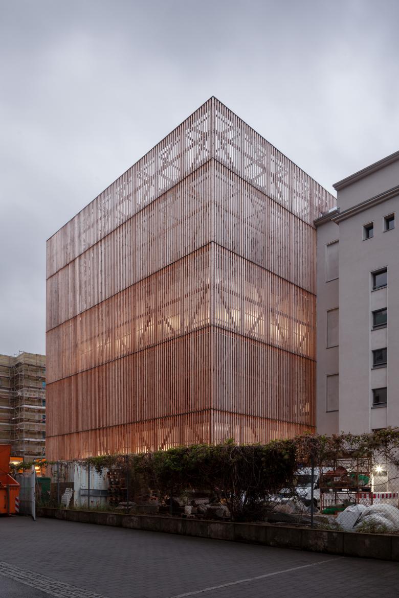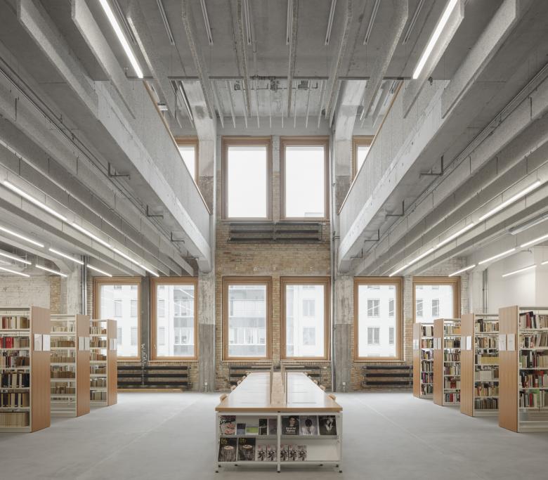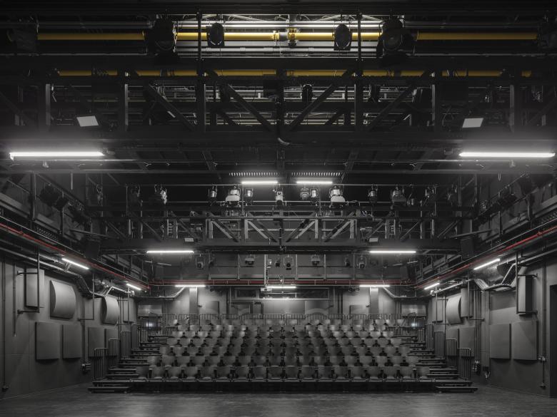 Viewed from the outside, the building consists of three parts: the refurbished old building with its front façade cut open, a timber-clad stage tower that links into this interface on the side, and a glass cafeteria box on the other side, pushed up against the flank of the old building. The meeting of raw and refined, old and new is visualised on the interior by a dividing line set at a height of 2.3 metres that runs throughout the entire building. All surfaces below this height are refined, all components above remain in their found or raw state. The 24-metre-high stage tower clad in wood makes the building on Zinnowitzer Straße recognisable from a distance as a public place.