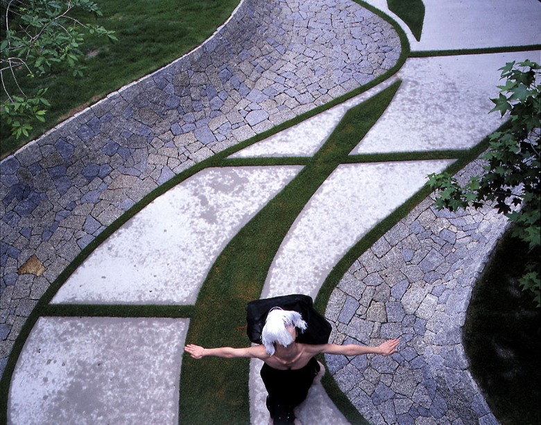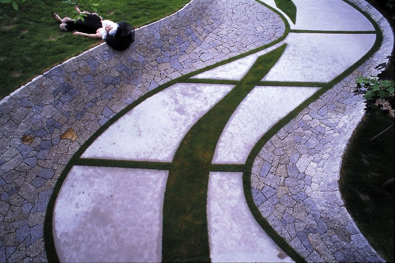 Un dels reptes d'aquest projecte era que un terç del jardí estava ocupat per un camí d'entrada. La nostra primera proposta va ser eliminar el camí d'entrada i separar un garatge encastat per a crear un jardí natural. El pla va ser acceptat inicialment, però després va ser rebutjat perquè el cotxe no podia sortir del garatge. Vam modificar la proposta per a incorporar un camí d'entrada pavimentat amb granit i suaument corbat en la gespa, fent l'efecte que el garatge estava aïllat de la carretera.
