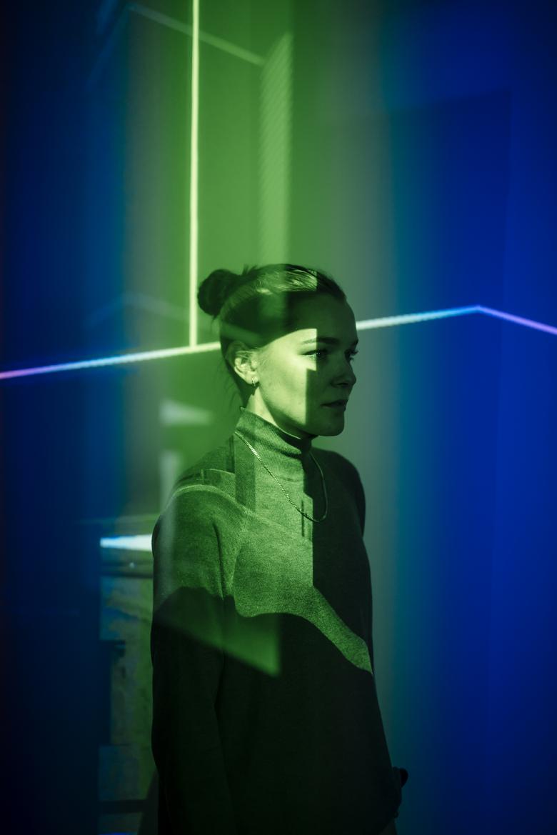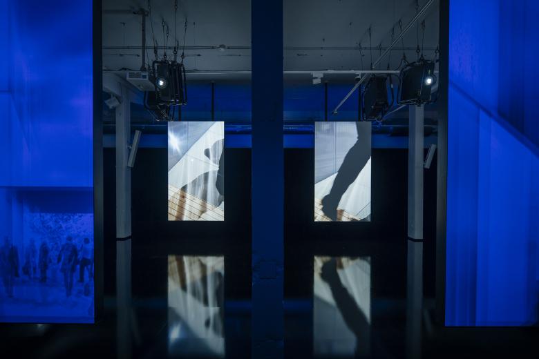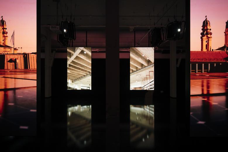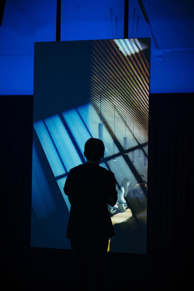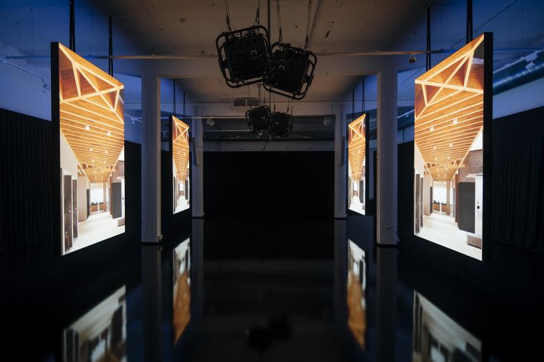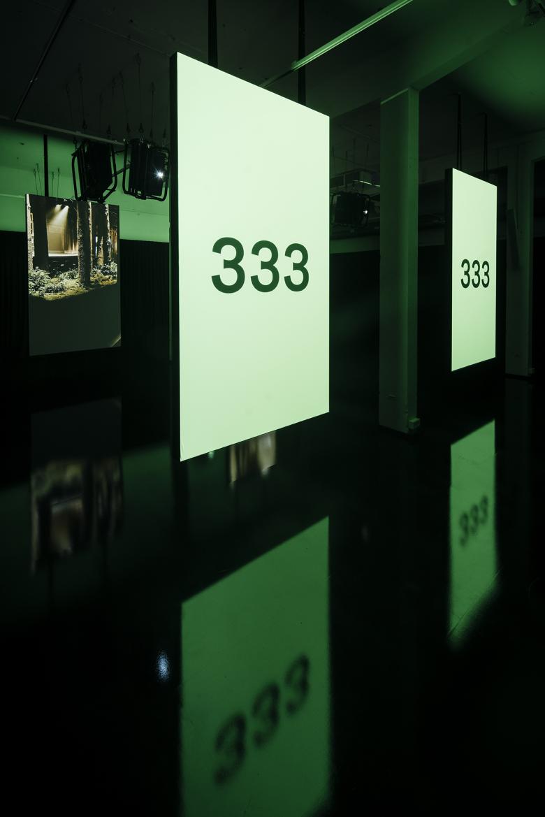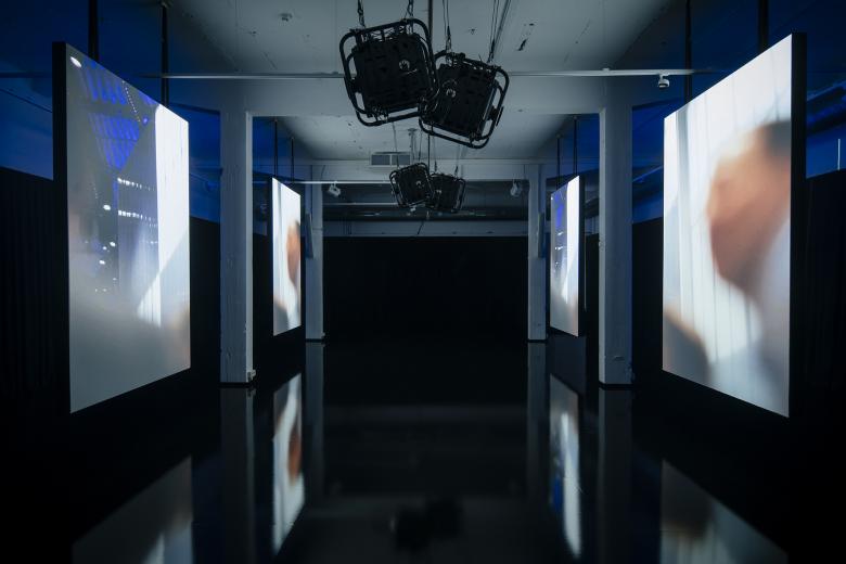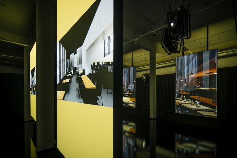 The exhibition consists of an installation of four doublesided screens, installed in a club-like basement with a mirroring black floor. On view are four of the agency's most seminal projects, for clients like Aesop, Hansgrohe, Occhio, and Gaggenau. Displayed one by one, the viewings are accompanied by the sound of a female narrator; an omniscient mind expressing questions, fragments of thoughts and ideas; poetically guiding the visitor through the experience.