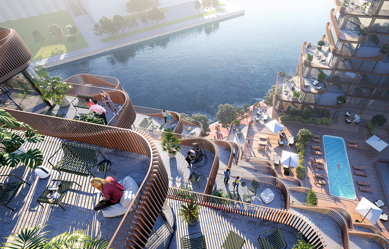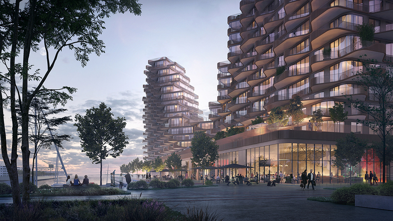 The building is shaped as a landscape with two high points and a valley in-between. By shifting these two "peaks" slightly apart - 3XN was able to maximize waterfront views from each unit. As the building steps back on higher floors, a large percentage of the suites benefit from the steps becoming spacious terraces. Within the "valley" of the project, the building's shared amenities are found; both indoor spaces such as community rooms, along with an expansive deck space with an outdoor pool.