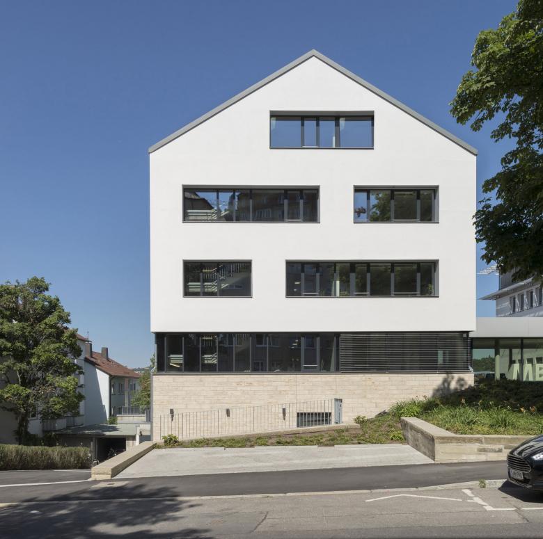 Die Bürgschaftsbank Baden-Württemberg liegt im Zentrum von Stuttgart und wird aus einem Ensemble von drei nebeneinanderliegenden Einzelgebäuden gebildet. Im Zuge der Erweiterung wurde das linke Bestandsgebäude durch einen Büroneubau mit Tiefgarage ersetzt. Dieser fügt sich mit seiner klaren und reduzierten Gestaltung stimmig in das städtebauliche Umfeld ein. Der Neubau wird ausschließlich als Bürogebäude genutzt und umfasst zusätzliche Büroflächen sowie eine Cafeteria. Im vierten Obergeschoss befindet sich ein Besprechungsraum mit vorgelagerter Terrasse und attraktivem Ausblick auf die Stadt. Ein eingeschossiger, zu beiden Seiten transparent gestalteter Gebäuderiegel dient als Eingangsbereich und verbindet Neubau und Bestand miteinander.