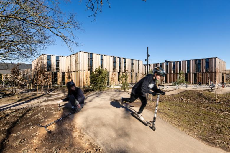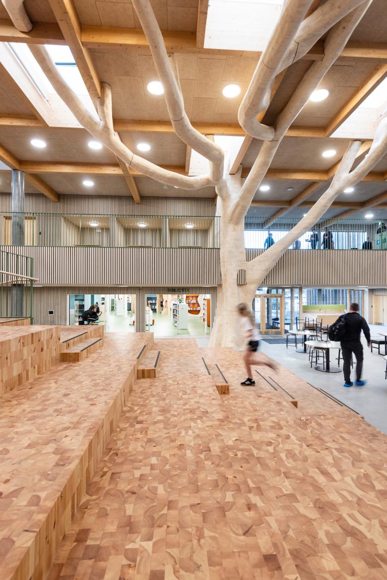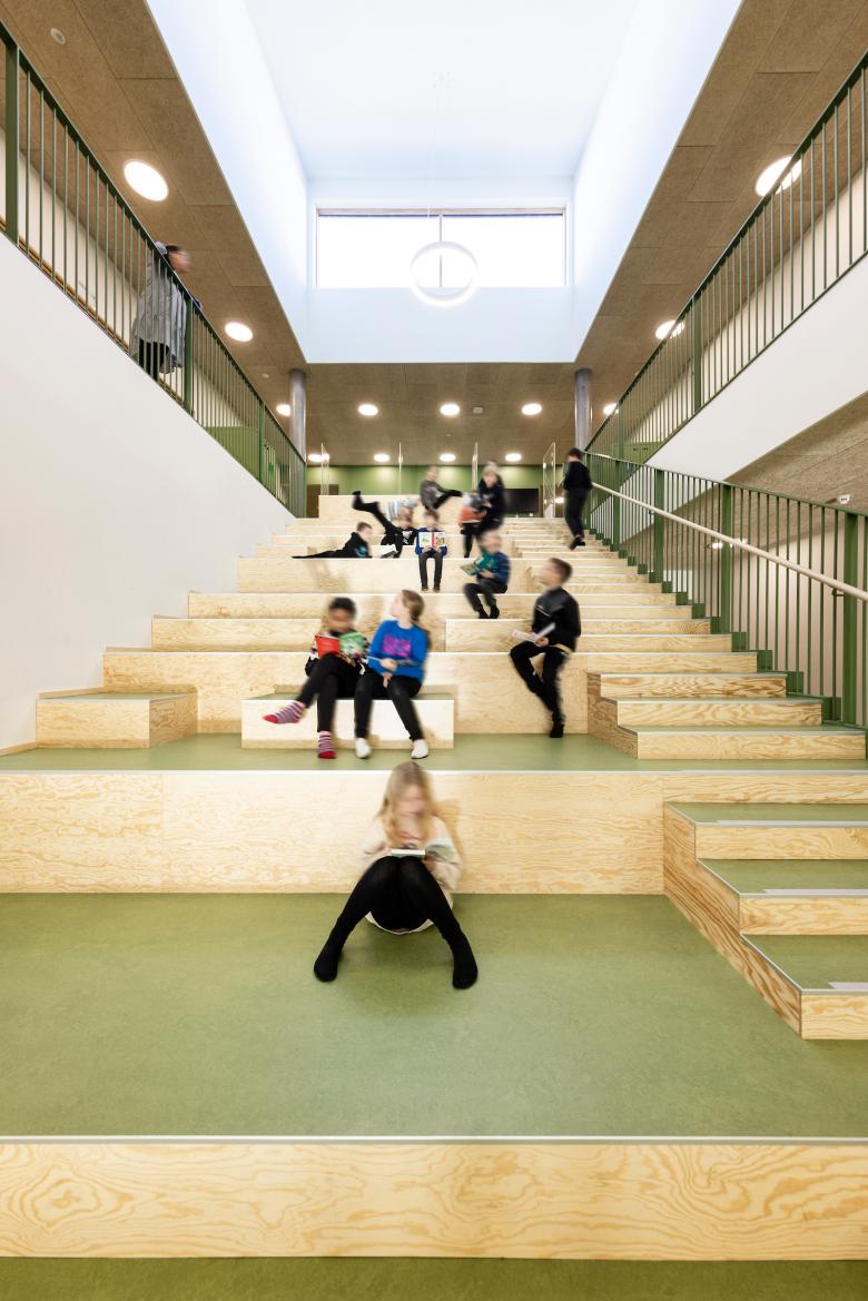 Structurally, the school is built up of clusters around an inner school square. As a unifying space, the square unites the surroundings, the main entrance and the clusters including the sports hall, the library, the youth centre, etc., in an open and atmospheric architectural grip. In addition, two courtyards give the square a light, bright and vibrant feeling while organizing it into clearly defined zones for learning and recreation.