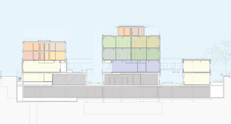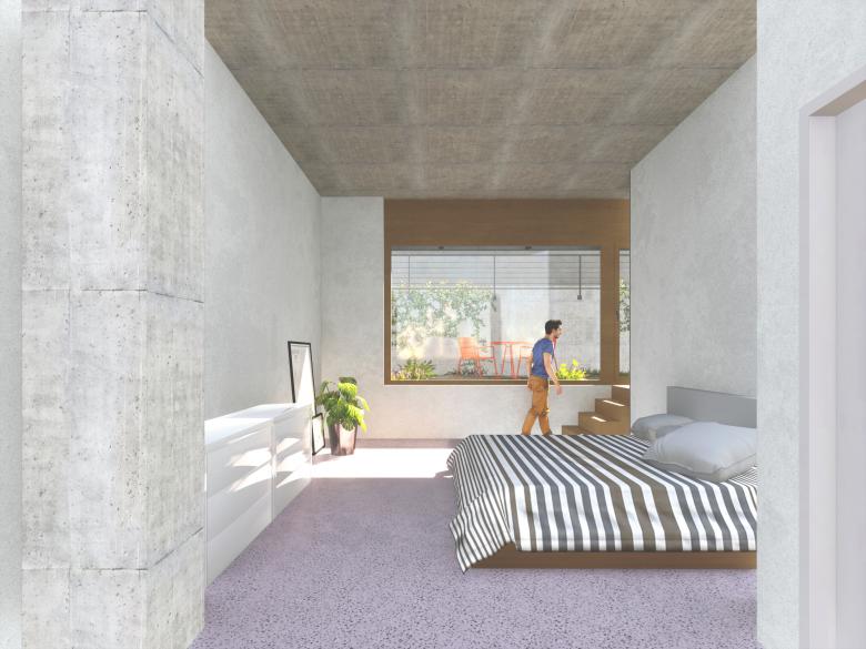 Das neue Wohnungsangebot hebt sich von den Familienwohnungen in der Umgebung ab, wodurch die Durchmischung des Quartiers gefördert wird. Die besonderen räumlichen Bedingungen der bestehenden Gebäudestruktur verlangen nach aussergewöhnlichen Wohnungstypologien. Viele der Wohnungen werden direkt von den beiden Innenhöfen erschlossen. Die grossen Raumhöhen ermöglichen trotz hoher Dichte grosszügig angelegten Wohnraum.