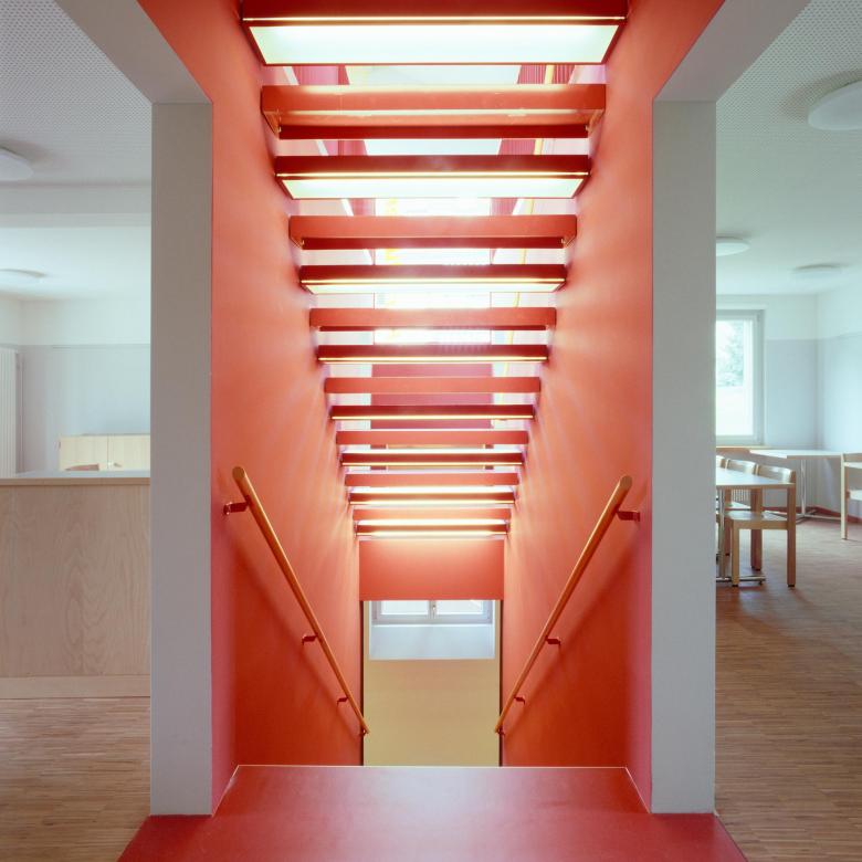 Die in den Fünfzigerjahren von Dr. Roland Rohn konzipierte Schulhausanlage mit klarer Aussenraumzonierung ermöglichte es, einen Kinderhort zu entwickeln, der vom Oberstufenschulbetrieb unabhängig funktionieren kann. Der Hort für Kinder der Unter- und Mittelstufe wurde in der ehemaligen Hauswartwohnung realisiert. Die Herausforderung bei dieser Arbeit war, einen Hort auf drei Geschossen zu realisieren. Dem unüblichen Eingang via Untergeschoss wurde mit einer grosszügigen und farblich intensiv gestalteten Treppenanlage Rechnung getragen. Dieser Raum schafft Ein- und Durchblicke sowie funktionale Beziehungen, die den Hortbetrieb auf drei Ebenen übersichtlich machen und als Gesamtheit beleben. Die eigentlichen Aufenthaltsräume sind farblich zurückhaltend gestaltet und lediglich mit einem Holzboden ausgelegt. Hier soll sich die Kreativität der Kinder entfalten. Der Aussenspielplatz befindet sich auf der Südostseite des Gebäudes und ist von den Freiräumen der Oberstufe klar abgegrenzt.