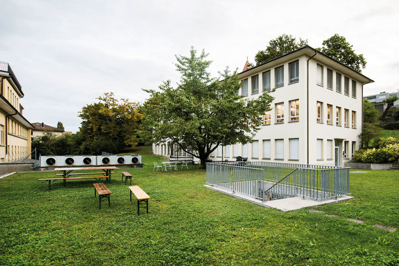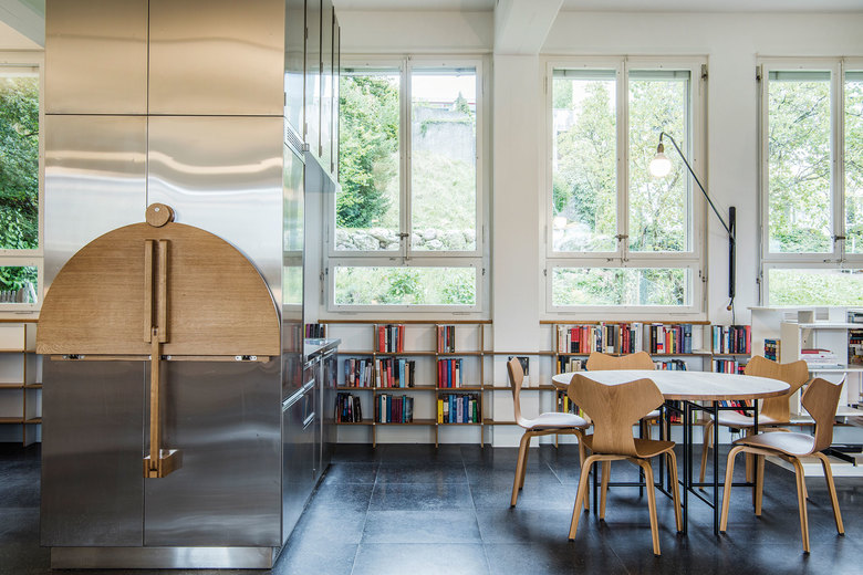 Die Bauherrschaft bezieht neue Räumlichkeiten in einem bestehenden Gewerbegebäude aus den 50ern Jahren. Das bedeutet für die Mitarbeiter eine grundsätzlich neue Art von Arbeitsumfeld. Es war eine Herausforderung die Vorzüge eines grosszügigen Einraumbüros, das Teamspirit vermitteln soll, mit den Annehmlichkeiten eines individuellen Arbeitsplatzes in einem abgeschlossenen Raum zu verbinden. Mächtige Betonstützen mit Unterzügen gliedern den Raum in zwei Hälften. Die rundumlaufende Befensterung schafft eine helle, klare Raumatmosphäre. Über den Eingangsraum wird man neu in die hangseitige Raumhälfte gelenkt, wo sich die dienenden Funktionen befinden. Auf der dem See und der direkten Sonneneinstrahlung zugewandten Seite wurden die individuellen Arbeitsplätze an langen Tischen in 2er- und 3er-Kojen angeordnet. Halbhohe Regale begrenzen den Raum und schützen den individuellen Arbeitsplatz vor Einblicken. Stehend bleibt der Raum als Ganzes überschaubar.